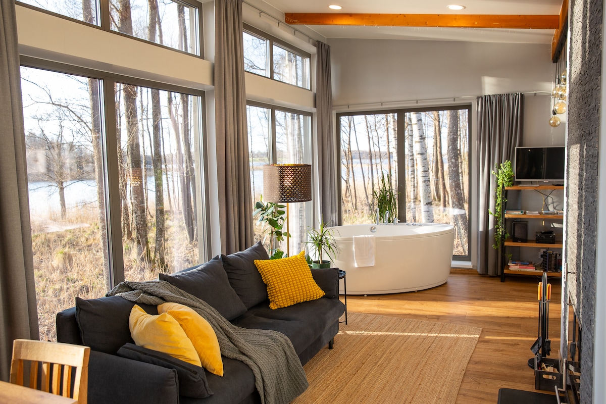 Escape to a secluded lakeside haven for a cozy and romantic holiday experience. Nestled by a tranquil lake with no neighbors in sight, it boasts an intimate connection with nature through huge windows, offering great views of the surrounding forest. Immerse yourself in luxury with a Jacuzzi strategically placed in front of these windows, creating unique experience. Unwind by the fireplace or indulge in the soothing atmosphere of a sauna. Your perfect getaway, surrounded by nature's serenity.