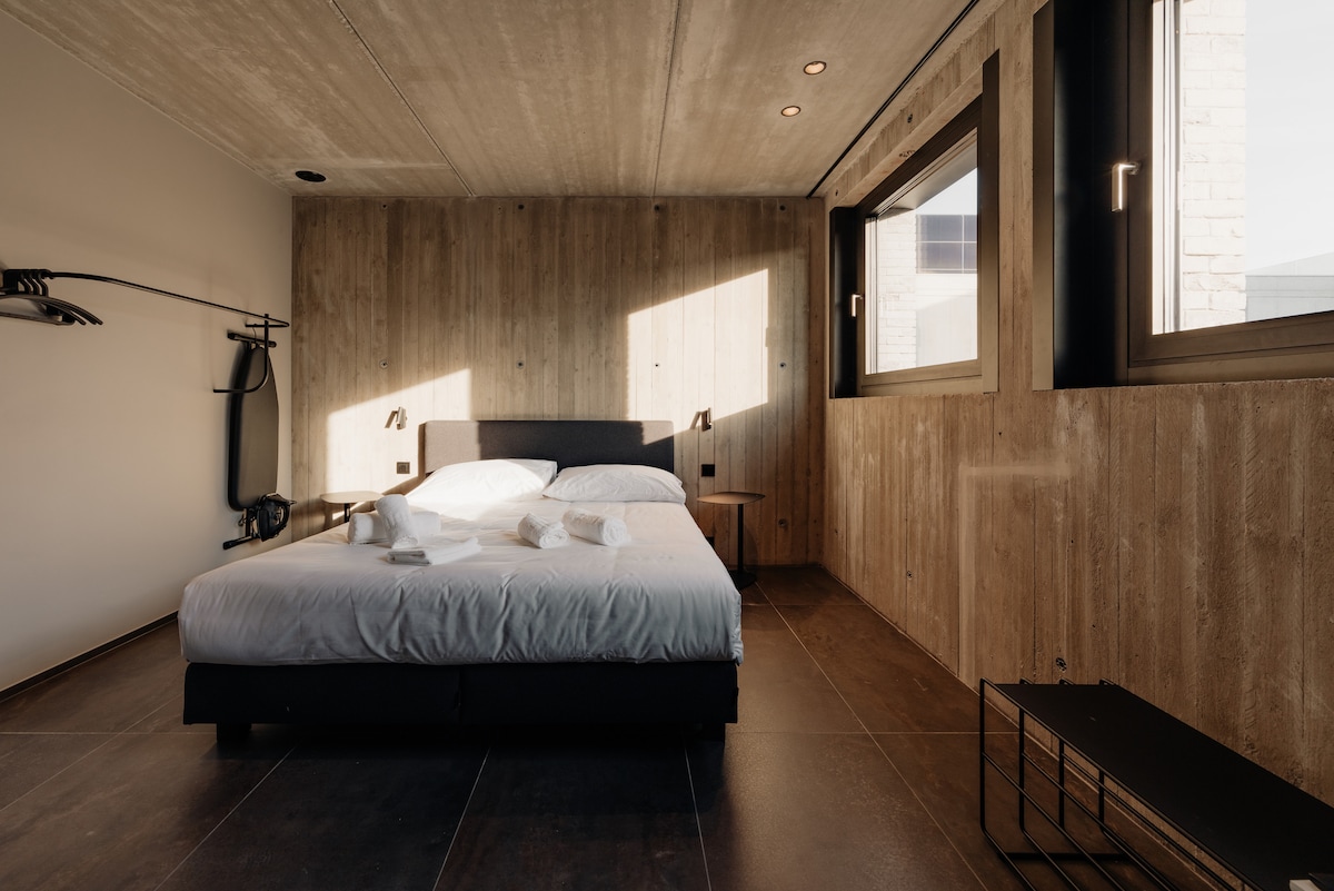 Cette chambre à Oupeye est un refuge végétal ouvert sur la Meuse. Le bois, la pierre naturelle et les plantes créent une atmosphère apaisante, en lien direct avec la nature. Les larges ouvertures laissent entrer la lumière et le paysage, brouillant la frontière entre intérieur et extérieur. À proximité du centre d’affaires Bord de Meuse (coworking, salles de réunion, salle de sport) et du RAVeL, le lieu est idéal pour travailler au calme et se ressourcer au bord de l’eau.
