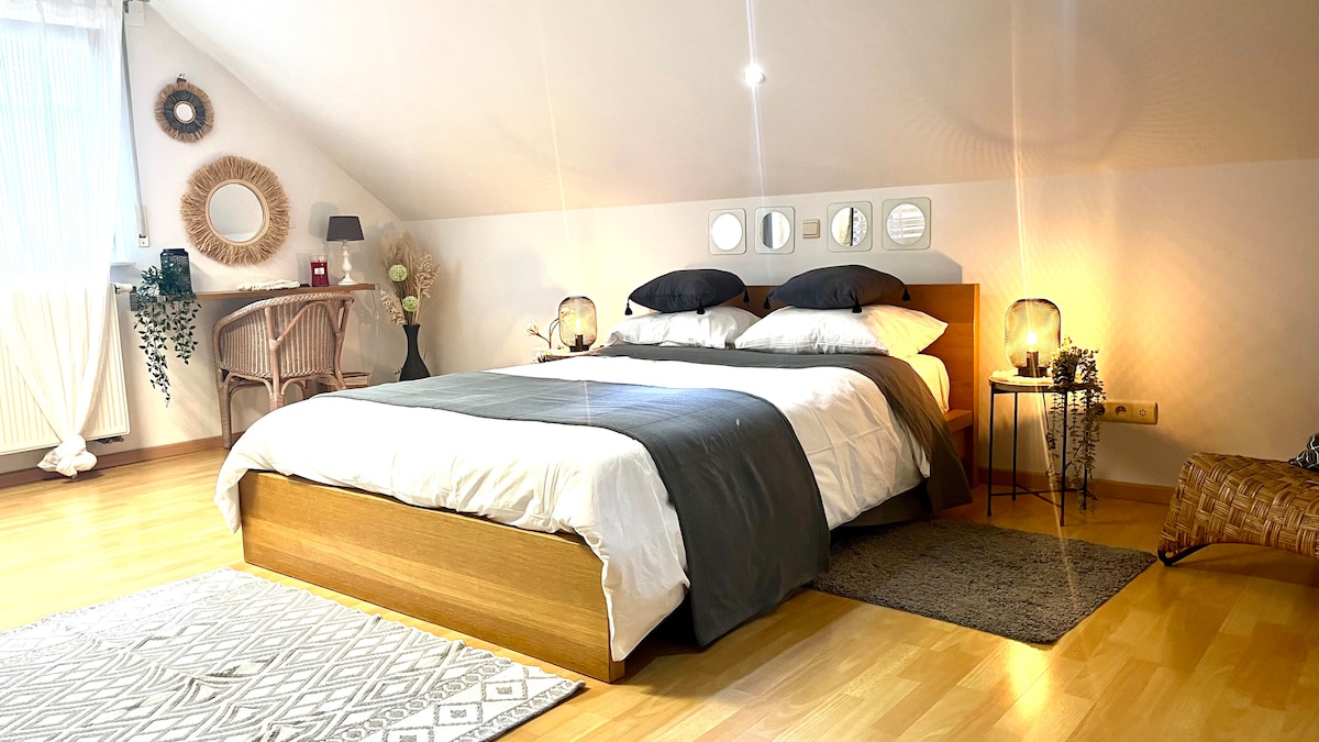 Aan de stadsrand van Sint-Truiden, de hoofdstad van Haspengouw, biedt deze rustig gelegen woning je werkelijk alles om je verblijf onvergetelijk te maken. Geniet van bubbels in de jacuzzi en warm lekker op aan de haard. TV of netflix kijk je met de beamer in de cosy zithoek. Enkel de fitnesskamer heeft geen airconditioning. Sint-Truiden is de beste startplaats voor een heerlijk verblijf in Haspengouw. We helpen je graag op weg! Officiële erkenning Toerisme Vlaanderen: comfortklasse 5 sterren