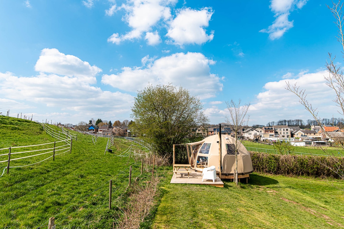 De ronde vorm en de vele ramen bieden werkelijk een prachtige kijk op het landschap. De unieke houten structuur geeft het een natuurlijke en sfeervolle uitstraling. De Dome met eigen buitenterras voelt direct aangenaam en warm aan. Tevens heb je buiten de gelegenheid om heerlijke maaltijden klaar te maken op de aanwezige kooktafel. Het verblijf is geschikt voor 2 personen en ingericht met een boxspring, koelkast, koffie-machine en waterkoker.