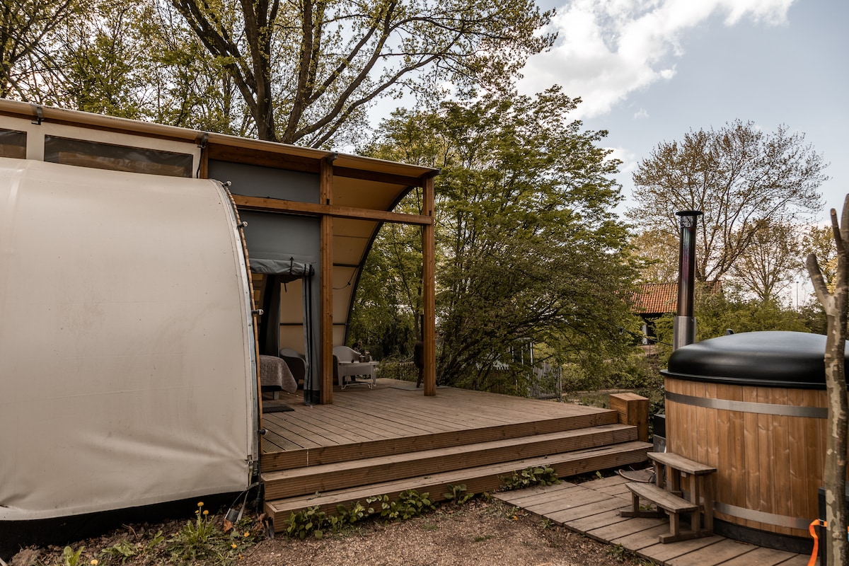 豪华露营小屋,配备私人热水浴缸
