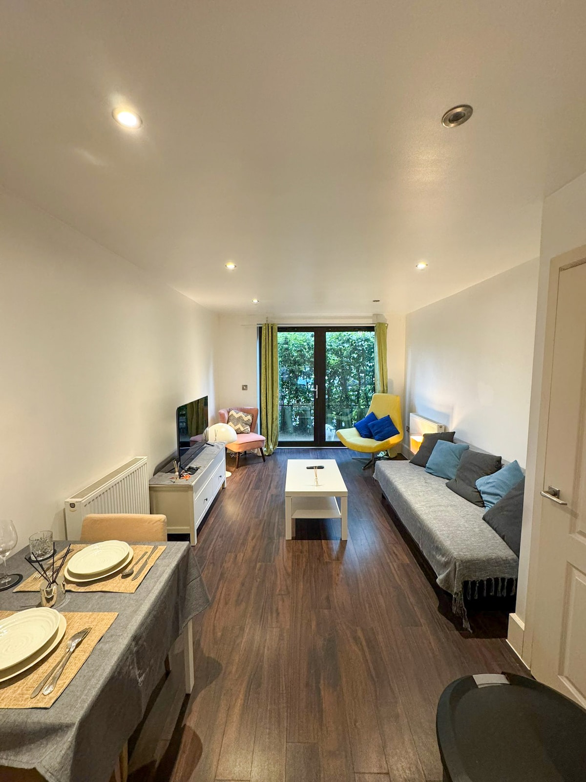 A newly renovated one bedroom apartment located in a quiet residential estate next to a park. Perfect for switching off whilst being a 8 minute walk away from the bustling business district of Canary Wharf Close to shops and transport links with Poplar & Westferry train stations a 4 minute walk away & Canary Wharf Cross Rail only a 8 minute walk. This unique cozy apartment has everything you need, from a relaxing rainfall shower, large screen TV & more to make your stay a memorable experience
