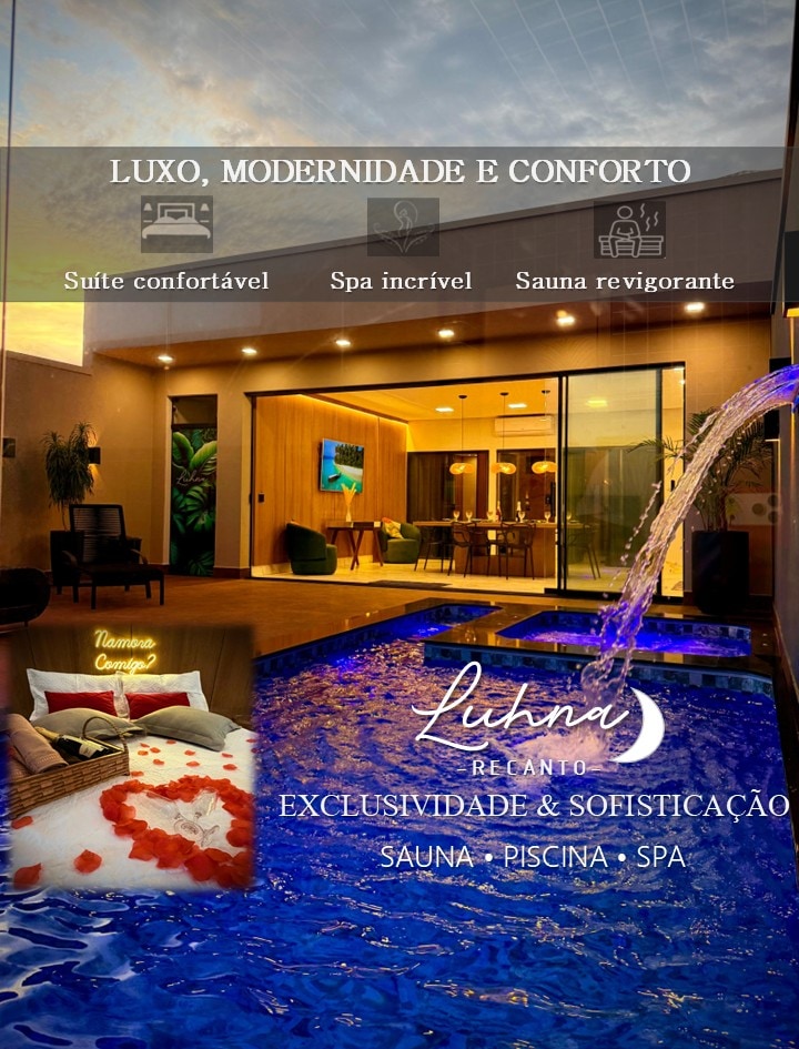 Relaxem, desfrutem do Recanto LUHNA✨ e tenham dias maravilhosos💚 com seu ente querido, parentes, família e amigos, nesta acomodação tranquila e extremamente moderna. O Recanto LUHNA✨, tem disponível para uso: Sauna Privativa Integrada com a Piscina e Spa. Fogão, Forno a Gás, Microondas, Air Fryer, Churrasqueira, Geladeira, TVs, Suite c/ banheiro privativo, c/ 2 camas box casal + 2 camas solteiro e ar-condicionado em todos ambientes. Divirta-se com a família com sofisticação e modernidade.