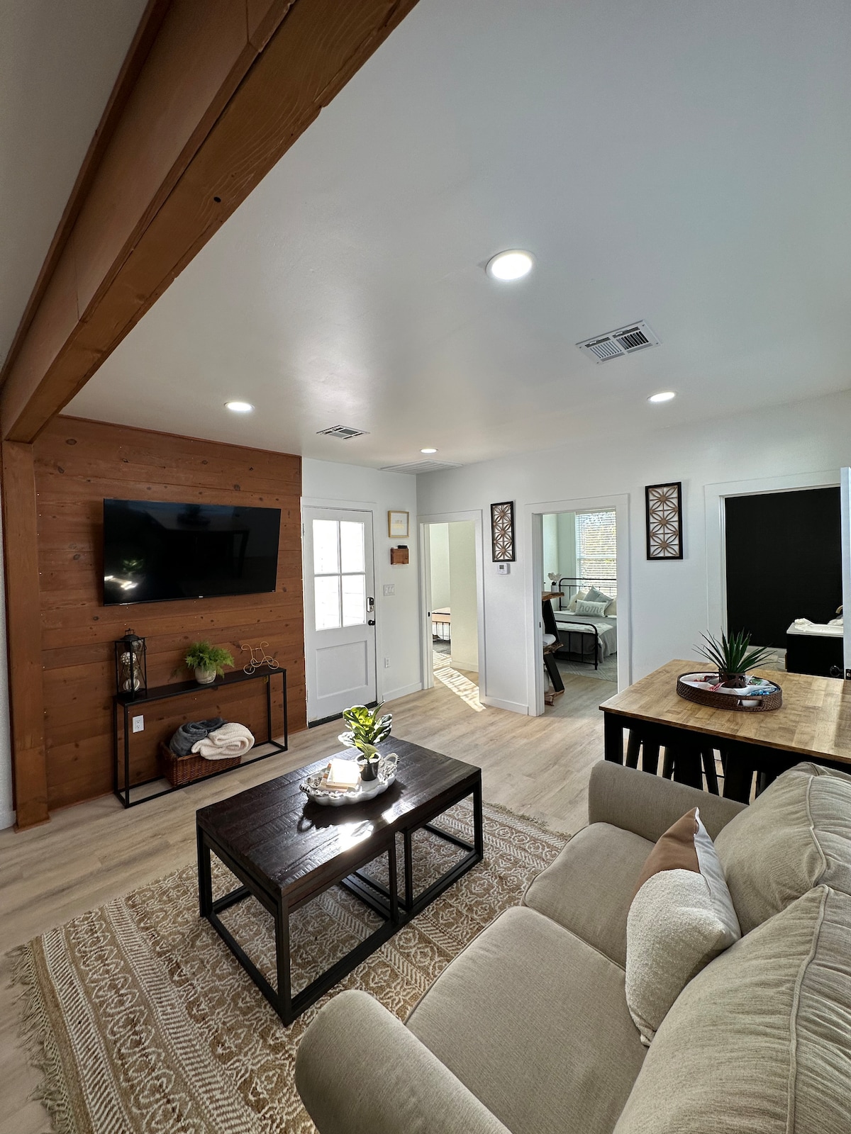 This cozy rustic-farmhouse style home combines traditional charm with modern comfort. You'll find a warm living space adorned with tasteful décor and golden accents. Open layout seamlessly connects the living, dining, and kitchen areas, perfect for gatherings. Throughout casita you will find historic touches of original building materials. The modern bathroom boasts unique finishes for a luxury-like experience. Outside, enjoy a private patio surrounded by lush landscape and activities.