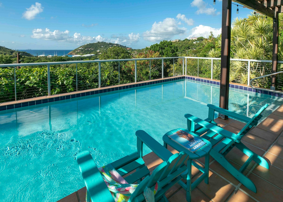 Welcome to CalypsoBlu, a secluded villa on St. Thomas with stunning Caribbean views. - Three air-conditioned bedrooms, each with private entrances - Spacious great room with living and dining areas - Covered veranda overlooking the pool and sun deck - Pool deck with chairs, table, and grill - Beautiful garden walkway and breezeway for relaxation - Complimentary concierge service for personalized trip planning - Watch sunsets and cruise ships from your villa