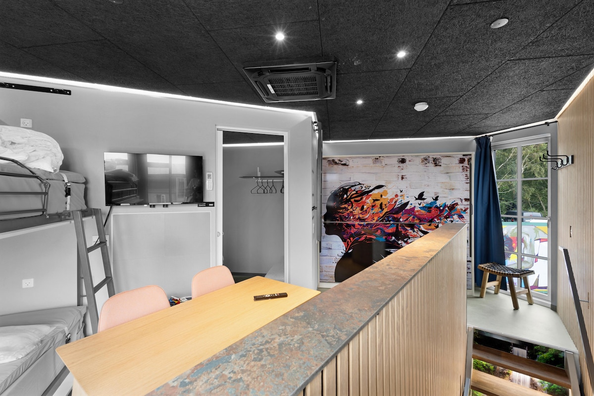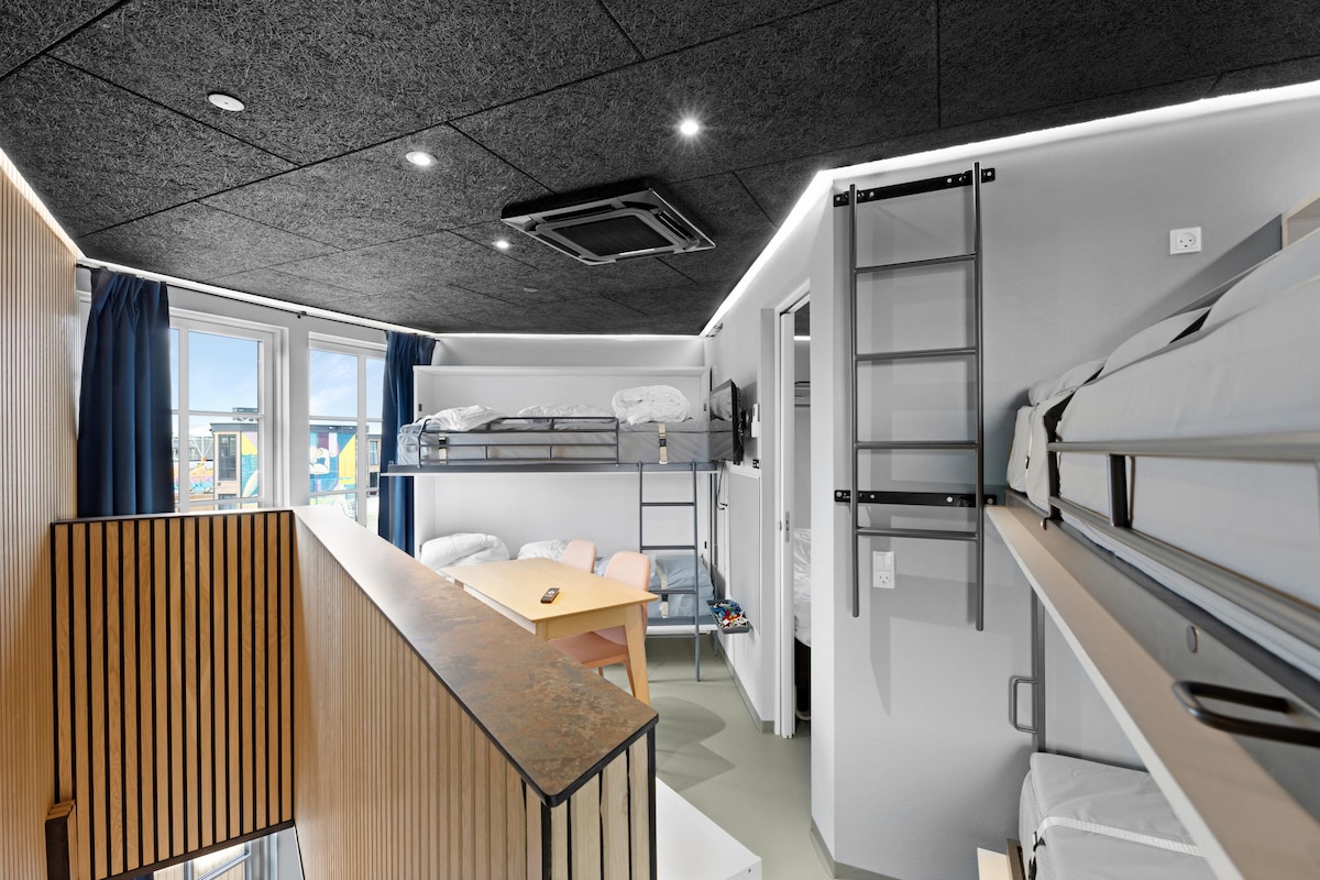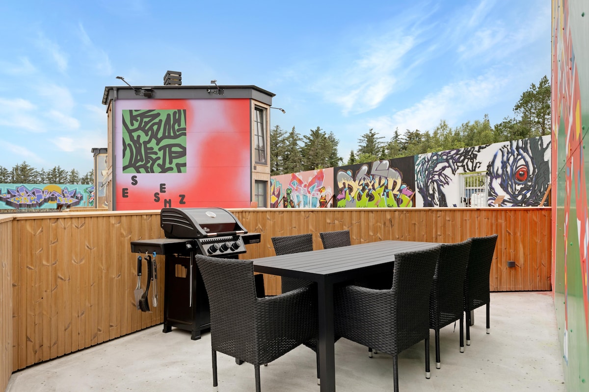Fun Art in Blokhus is not just an activity park with innovative and unique holiday apartments – it's an experience for the whole family! In addition to the lovely holiday apartments, you'll find everything from a trampoline park and playland to street art and a ceramics workshop, concerts, and more! Fun Art is located in a beautiful natural area near Blokhus and offers fun and entertainment for both young and old. As you move around, you'll find yourself in a universe where talented street artists have painted in their own style on the facades of the modern apartments, and the interiors are designed in the Tiny Houses concept. Linen packages will be ready, with options for room service or dining at Fun Art's delightful restaurant or grilling on the apartment's terraces. Details about the Holiday Apartments: The hotel apartments can accommodate 6 guests with four bunk beds and a double bed – all sleeping spaces are located on the first floor. If you are fewer people, you can fold the bunk beds into the walls, making the space even more practical and adding a cool style. Every square meter serves a specific function, and you'll find everything you need for an overnight stay near Blokhus, right in the middle of an artistic experience. On the ground floor, Fun Art's holiday apartments include a kitchen/living room, a bathroom, and a lovely terrace. Here, you'll find all necessities such as a dishwasher, washing machine, dryer, and grill. During concerts and events, it is truly a special experience to move around in this fantastic universe! Of course, there are also charging stations for electric cars. All apartments are non-smoking. Activities for Everyone! When you rent one of these special holiday apartments, you get free access to all of Fun Art's activities, allowing you to enjoy a vacation filled with both relaxation and experiences. The area offers stunning nature, one of Denmark's best beaches, and most popular holiday towns, as well as Europe's best amusement park, Fårup Sommerland. With so many opportunities for days of diverse experiences, no one in the family will be bored! Combine your beach trip with fun activities at Fun Art – enjoy a quiet moment in the ceramics café followed by a challenge on the football golf course, bounce on the trampolines, or attend a concert in the large concert hall, where you can also dine and enjoy VIP seating on the balcony. At By Sommerhuse, we can confidently say that Fun Art is the perfect place to rent a holiday apartment in Blokhus, taking vacation home rentals to new heights.