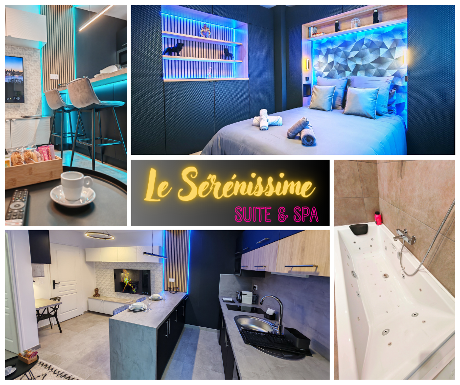 Bienvenue au " SÉRÉNISSIME ". Séjournez dans un appartement moderne et esthétique. Imaginé par notre architecte, l'accent a été porté sur la qualité, l'élégance et le confort. Vous bénéficierez d'une expérience de sommeil optimale car vous dormirez sur un Matelas EMMA (matelas le plus vendu et le plus primé en France pour plaire à un maximum de voyageurs!) Coté bien-être, vous profiterez d'un moment relaxant dans la baignoire hydromassante 1 place pour un moment de pur bonheur.