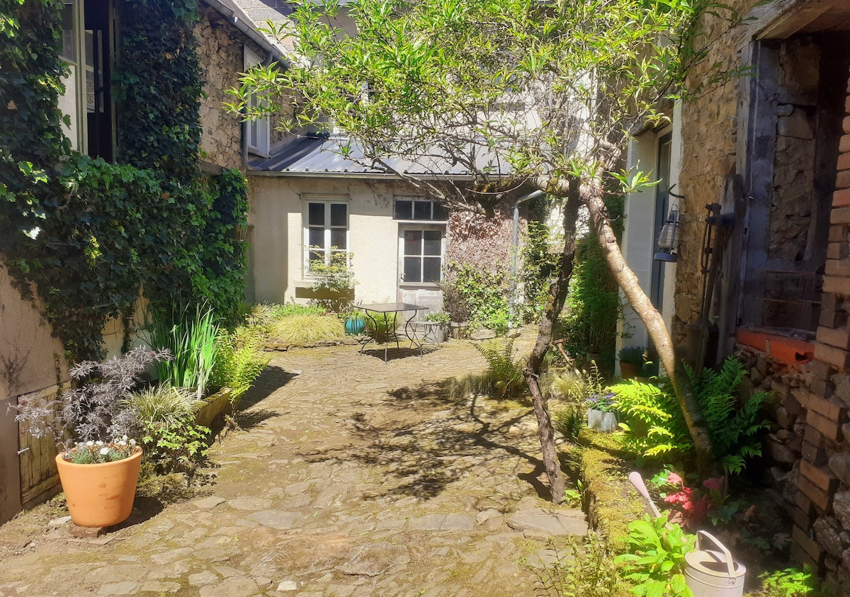 En façade de la maison principale, en cœur de bourg, rien ne laisse supposer la présence de la petite maison. Entre cour et jardin, en haut de l'escalier en pierre, vous attend une maison d'hôte donnant sur un jardin ombragé sans vis-à-vis. Si la cour est un espace de rencontre et de convivialité avec les habitants du lieu, le jardin, lui, vous permettra de bénéficier d'un espace d'intimité, un écrin de verdure avec vue sur la village où prendre vos repas et vous détendre.
