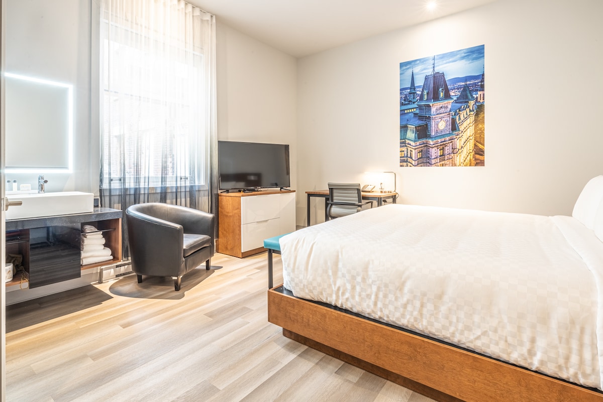 The king room is ideal for a lone traveller or a couple. It includes a king bed and a private bathroom. Each room includes air conditioning, heating, wireless internet, a king bed, quality bedding, a coffee maker, a mini-fridge and a flat-screen TV. It is centrally located and just a few minutes to vibrant St-Joseph street and its dozens of restaurants and shops. There is an elevator on site.