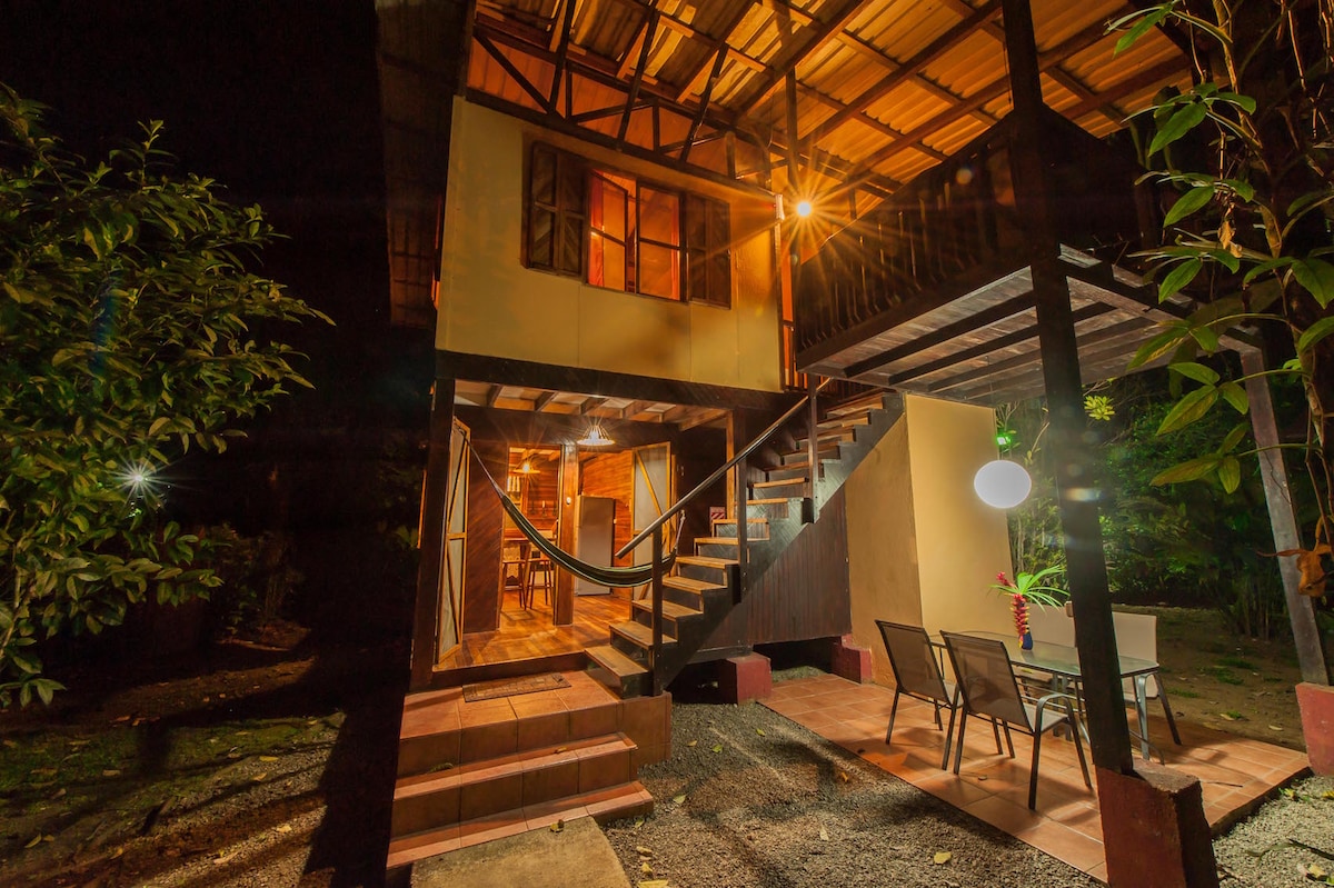 Take it easy at this unique and tranquil getaway. Enjoy the peaceful ambiance of nature while experiencing stylish modern comforts. This space was designed to create life long memories. From the traditional roof structure to the glass panelling, this bungaló was built using a mix of natural and modern materials and finishes. Enjoy the peace and magic of the jungle as you watch the leaves fall from the trees all around you.