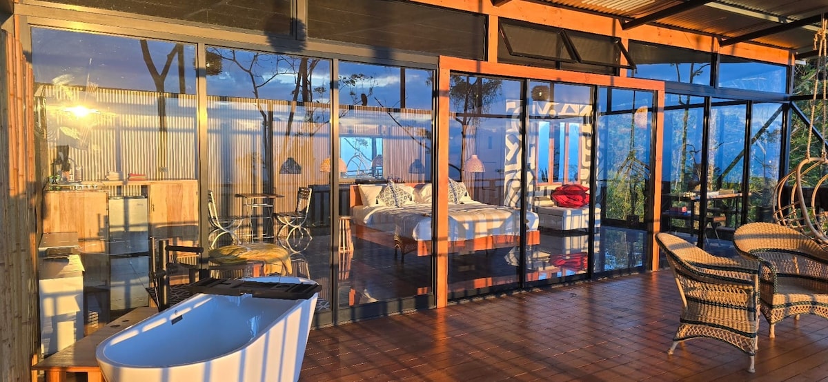 Alojamiento solo para adultos. ¡¡Bienvenido a unos de los lugares más impresionantes del mundo!! Todas las cabañas son para dos personas e incluyen cocina con sus respectivos utensilios, nevera pequeña, pantalla plana 50 pulgadas, aire acondicionado, parlantes bluetooth, internet 100 megas, armario, camas tamaño queen, ropa de cama, baños privados con secador de pelo y artículos de aseo gratis, toallas de baño, toallas de playa, terrazas con vistas a la piscina. También incluyen caja fuerte.