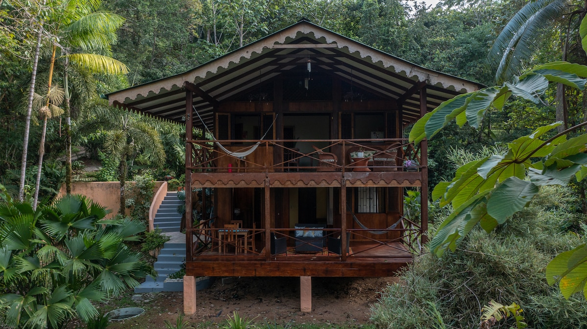 Take it easy at this unique and tranquil getaway, a tropical oasis settled into the mountain side of the jungle over looking the lush rain forest! Beautiful custom built Guest house, perched on a hill within a 365 acre Caribbean farm. Fine crafted wood detailed finishings. Fully furnished, charming kitchen fully equipped for cooking, living room, large rainfall shower(s), with meditation garden, large outside deck and fountain. Relax in the hammocks enjoy the sounds of the river and wildlife.