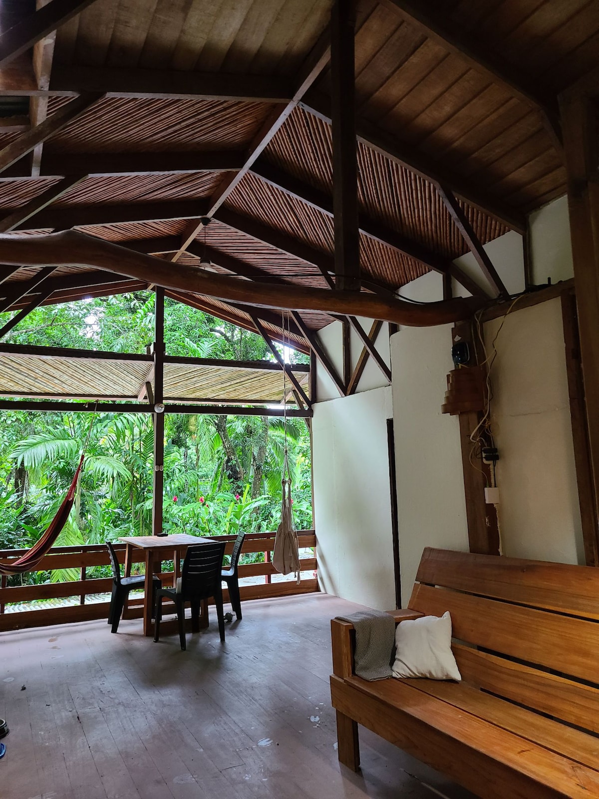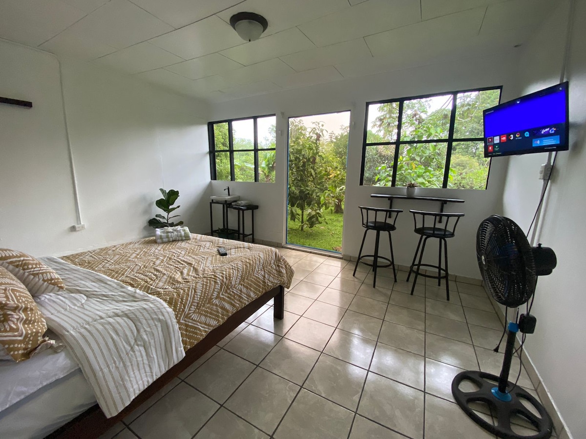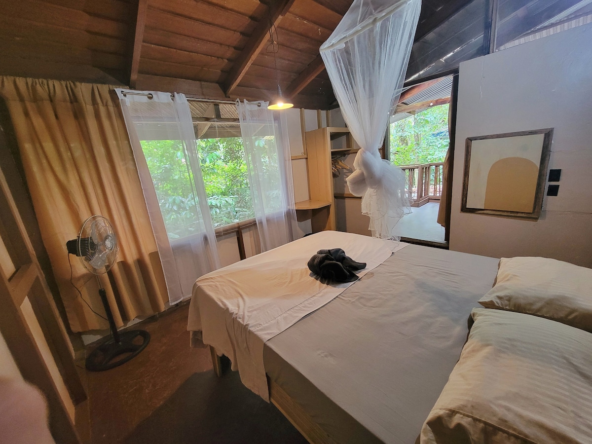 Rodeado de árboles, creando un ambiente de paz y conexión con la naturaleza. Desde tu cama, vista a los árboles y el cielo, y por la noche te duermes viendo las estrellas, sin cortinas que bloqueen la magia del entorno. Puedes ver lapas, tucanes y variedad de aves, ideal para los amantes del bird watching. Perfecto para leer, meditar o incluso teletrabajar. Échale un vistazo a nuestra segunda habitación con A/C: Green Lodge #2| 40 mins de Pavona-Tortuguero