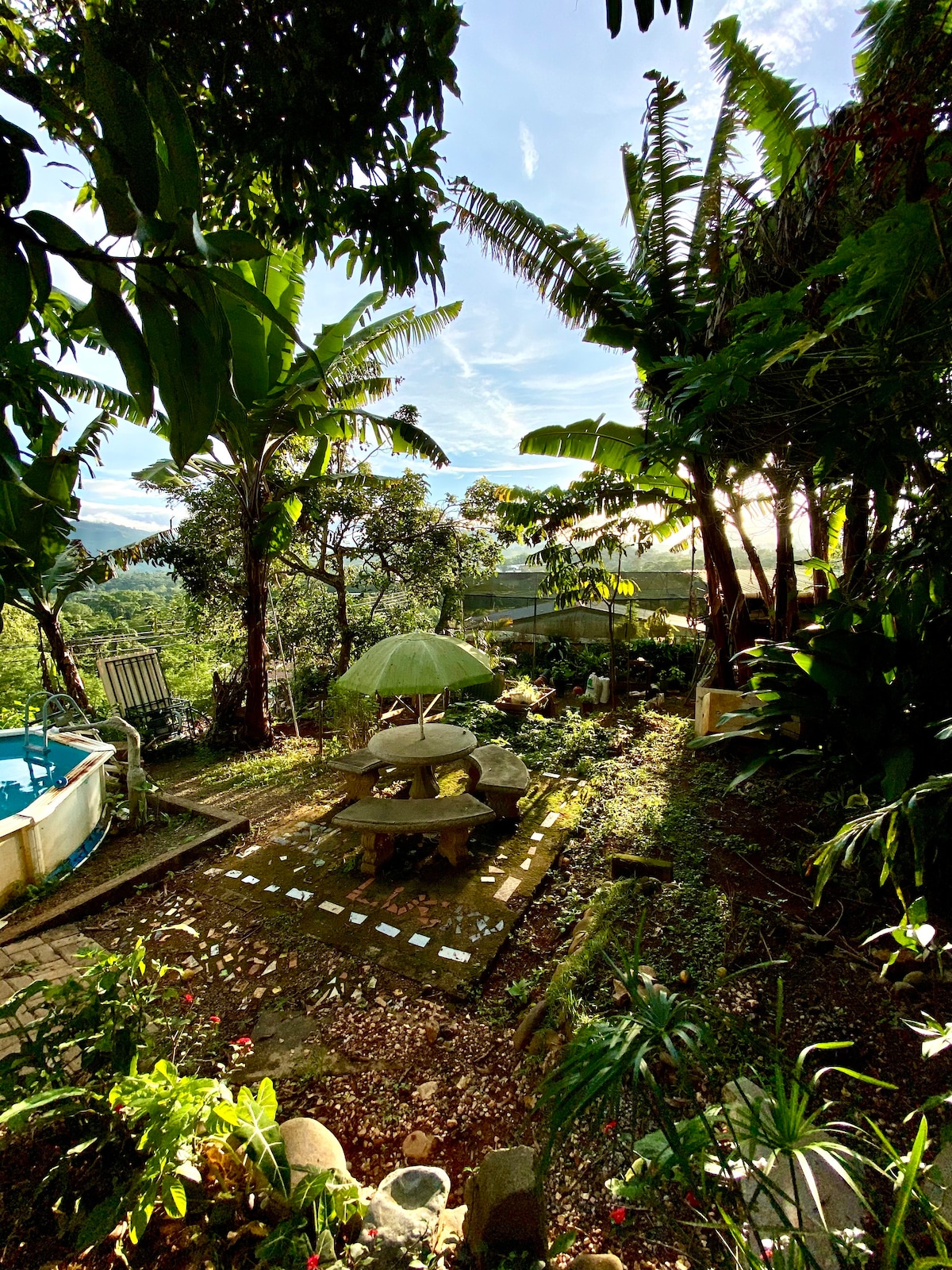 Located on a peaceful gated 2-acre tropical estate in Turrialba, surrounded by nature and beautiful birds. The pool features Indonesian Sukabumi stone, which stays cool and feels great on your feet. This private accommodation is one of several homes on the estate that share the pool and gardens. The property is filled with fruit trees and is just minutes from downtown Turrialba, close to white-water rafting, hiking, biking, and bird watching.