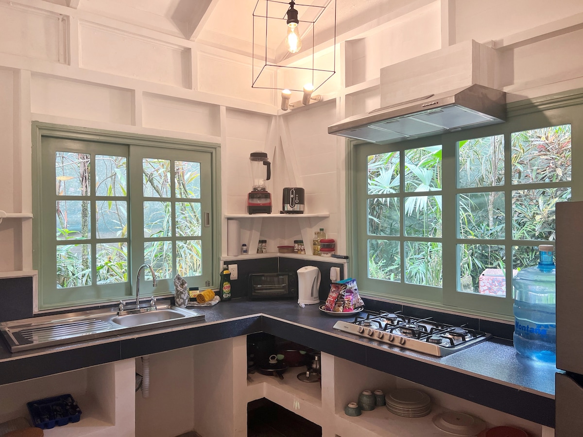 COMFORTABLE HOME IN RAINFOREST GARDEN Fully equipped 2-bedroom house in wonderful tropical setting. Enjoy nature & spot wildlife at Casa Lirio. Walking distance from gorgeous beaches (1.5km), 5 min drive to lively Puerto Viejo & 20 min to Cahuita National Park. Fiber optic wifi, airco, fully fitted kitchen with all basics & 18L bottled water. AC. Breakfast US$15 pp per day, paid laundry service. The house is on the outskirts of the property, so there is some street noise.