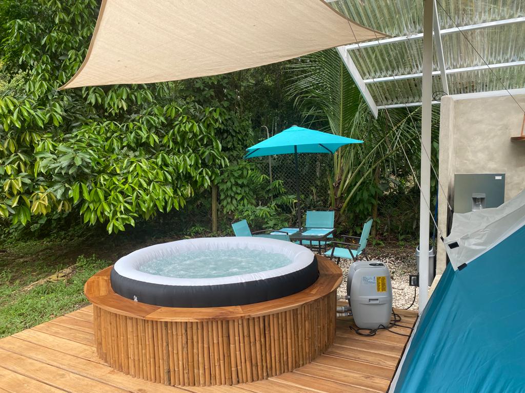 Nuestro alojamiento único en propiedad privada te espera. Accede a través de un sendero a una tienda acogedora, rodeada de exuberante selva. Relájate en el jacuzzi privado o disfruta de las vistas desde la terraza. Cuenta con una cocina completamente equipada. Cada detalle está diseñado para ofrecerte un refugio único, donde la tranquilidad y el romance se entrelazan perfectamente.