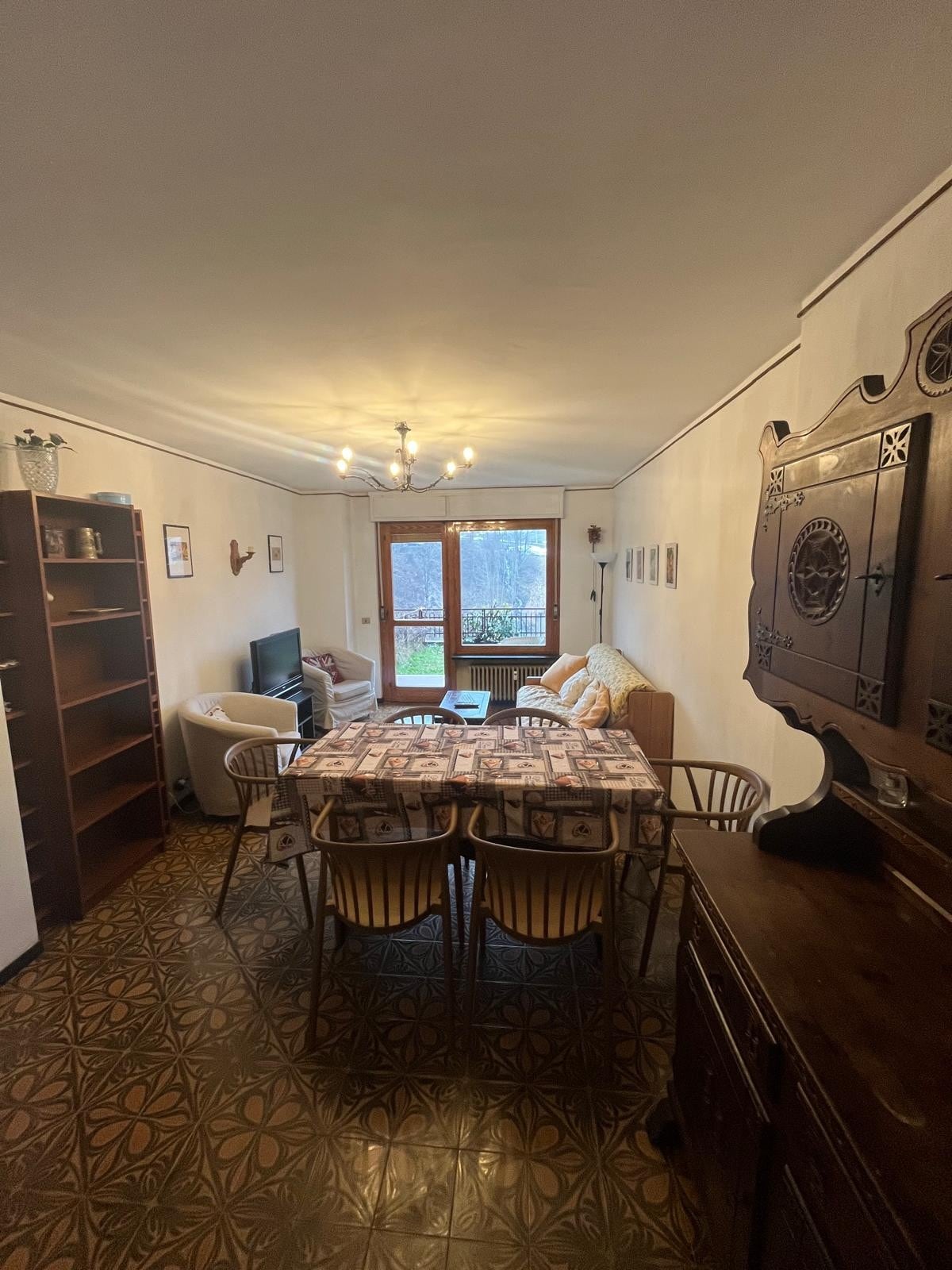 Appartamento mansardato con vista spettacolare sito all'ultimo piano con ascensore di un complesso privato degli anni 70 con portineria annessa. L’ascensore si ferma al quarto , l’ultima rampa per arrivare al quinto va fatta a piedi : entrata, cucinotta, grande soggiorno con zona pranzo, due camere da letto e bagno con vasca. 5 posti letto con la possibilità di arrivare ad 8 tramite brandine pieghevoli. parcheggio condominiale e garage. Davanti al condominio grande campo privato con ruscello.