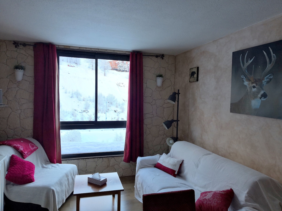 Confortable appartement 2 pièces de 32m2 + terrasse Vue magnifique ! Excellent état. Décoré avec soin. 1 chambre séparée avec lit double Salon avec 3 couchages Coin-cuisine équipée Salle de bain avec lavabo et baignoire, sèche-serviette. WC séparé. Casier à skis aménagé fermant à clé au même étage. Parking gratuit.
