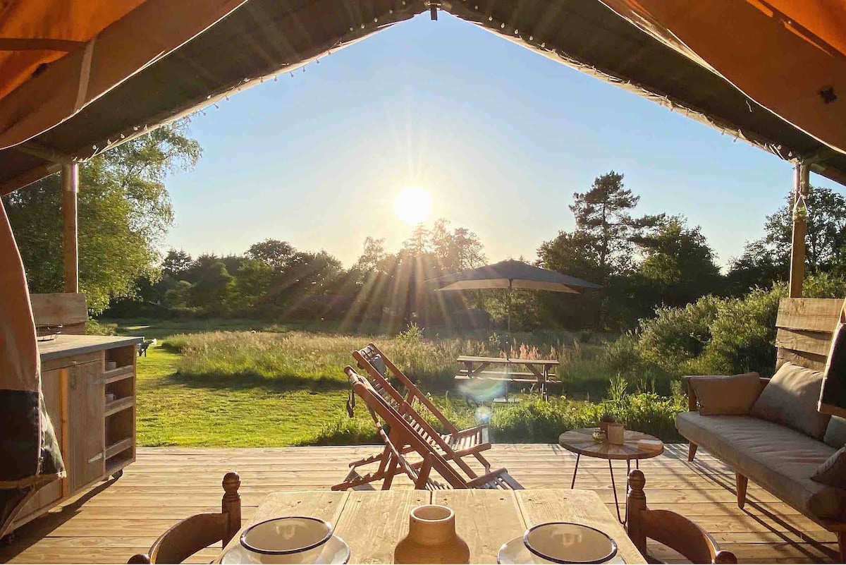 Luxury glamping safari tent with private wood‑burning hot tub in Corréze countryside. Set on a small, exclusive campsite with just a few tents, each with space and privacy. Perfect for a romantic getaway yet family-friendly thanks to the open layout and private pitches. Experience a calm, boutique atmosphere, enjoy stunning countryside views, and savor a truly personal and elevated camping experience with thoughtful, comfortable touches for unforgettable stays.