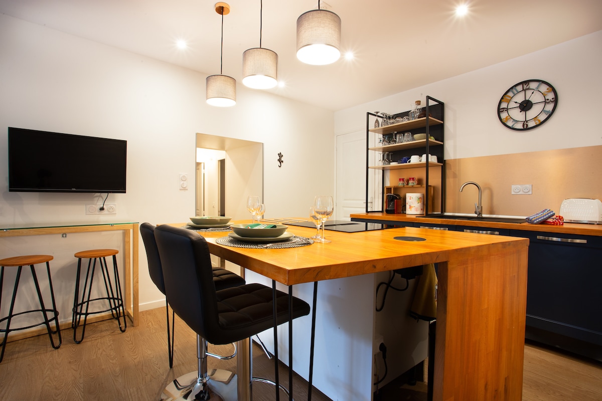 Our modern duplex apartment is a stylish accommodation located in the beautiful Dordogne. It features a tastefully decorated bedroom located on the mezzanine level, providing ample space. Highlights: · Queen bed (160 x 200cm) · 55 m2 · Terrace · Luxury design & amenities · Sofa · Smart TV · Free Super high-speed internet (Starlink) · Fully-equipped open kitchen · Separate Bathroom w/ shower *Not suitable for guests with limited mobility