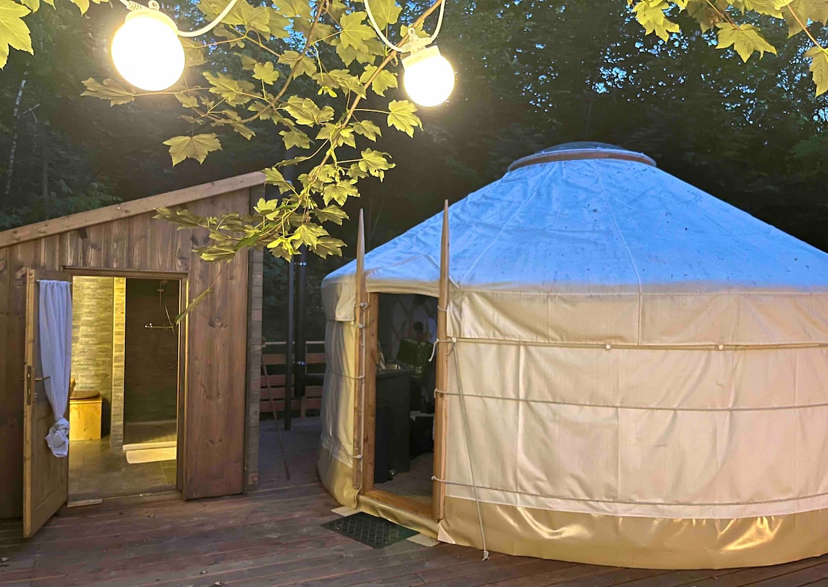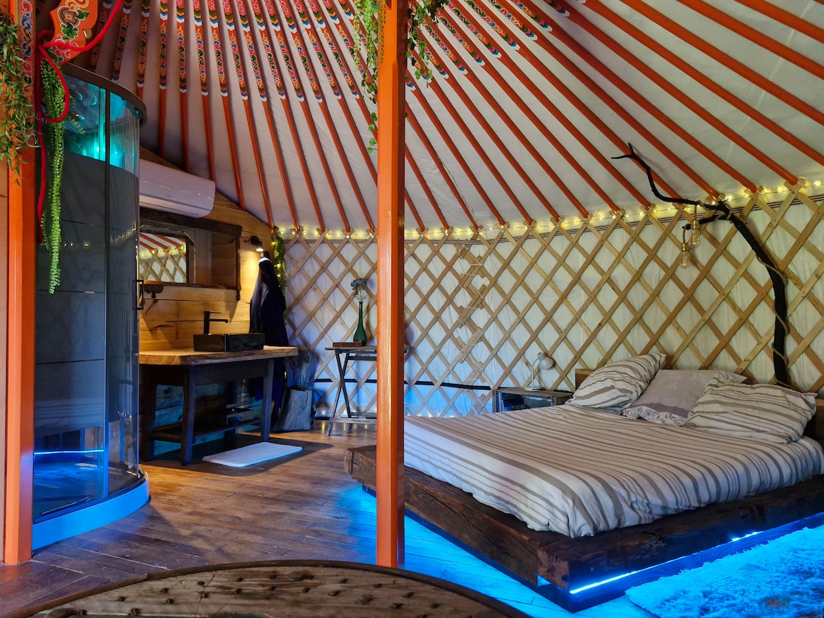 Séjournez dans notre grande yourte contemporaine de 50m², nichée sous des arbres au cœur d’un environnement naturel riche en biodiversité. Magnifiquement décorée, elle vous séduira par sa sensation d'espace et de volume, sublimée par la douce odeur du bois. Parfaitement intégrée dans son cadre, cette yourte offre une expérience authentique et apaisante, idéale pour se déconnecter du quotidien. Enfin, détendez-vous dans le bain nordique tout en admirant la nature environnante.