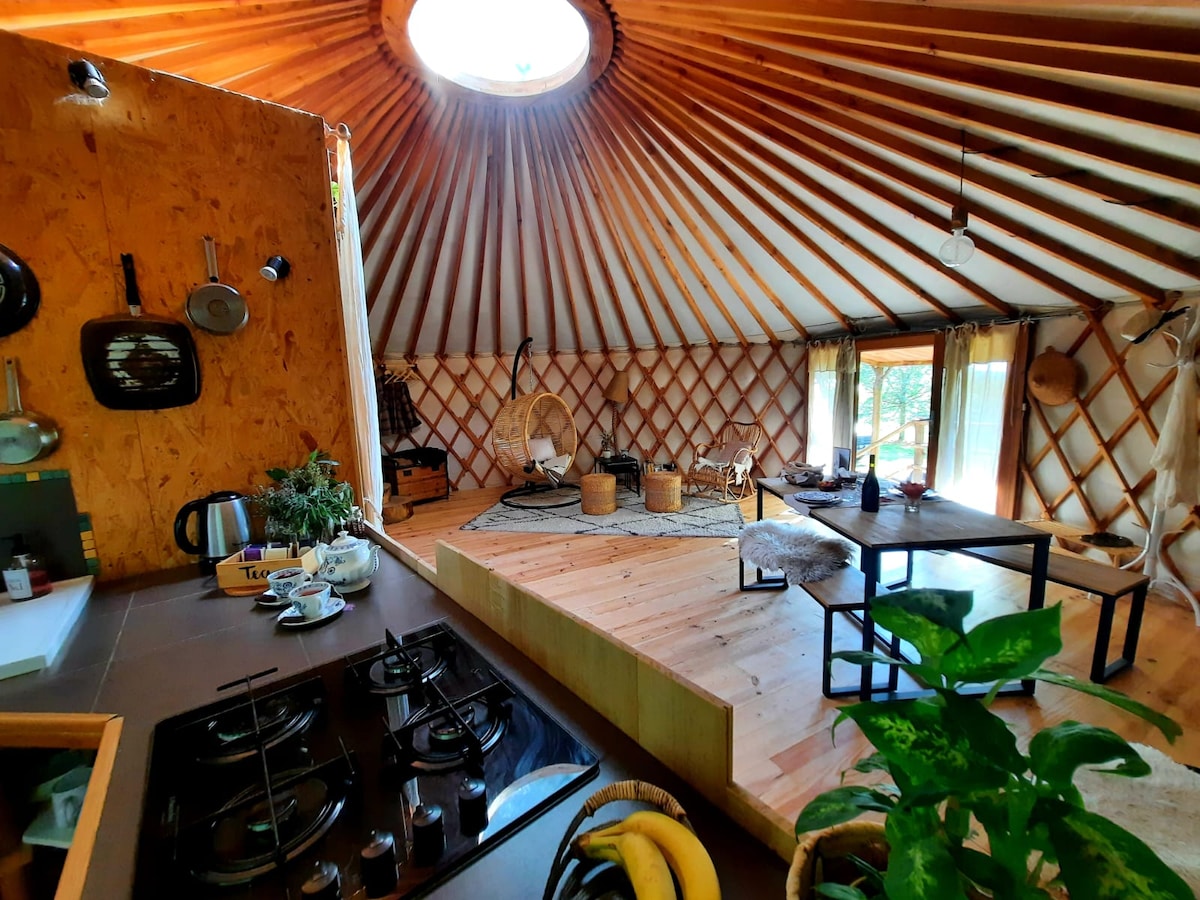 Dans un parc arboré de 8000m2, vous vivrez un séjour ressourçant dans la nature; nos voisins sont les vaches dans le pré d'à côté, les buses, les hérons, les écureuils, les grenouilles de la mare, les libellules...un lieu idéal pour se mettre au vert et retrouver le contact avec la nature! Nous avons à cœur de vous accueillir dans une yourte confortable, le nettoyage de la yourte et des sanitaires est soigné; un coin cuisine est à votre disposition, il est ouvert sur l'extérieur.