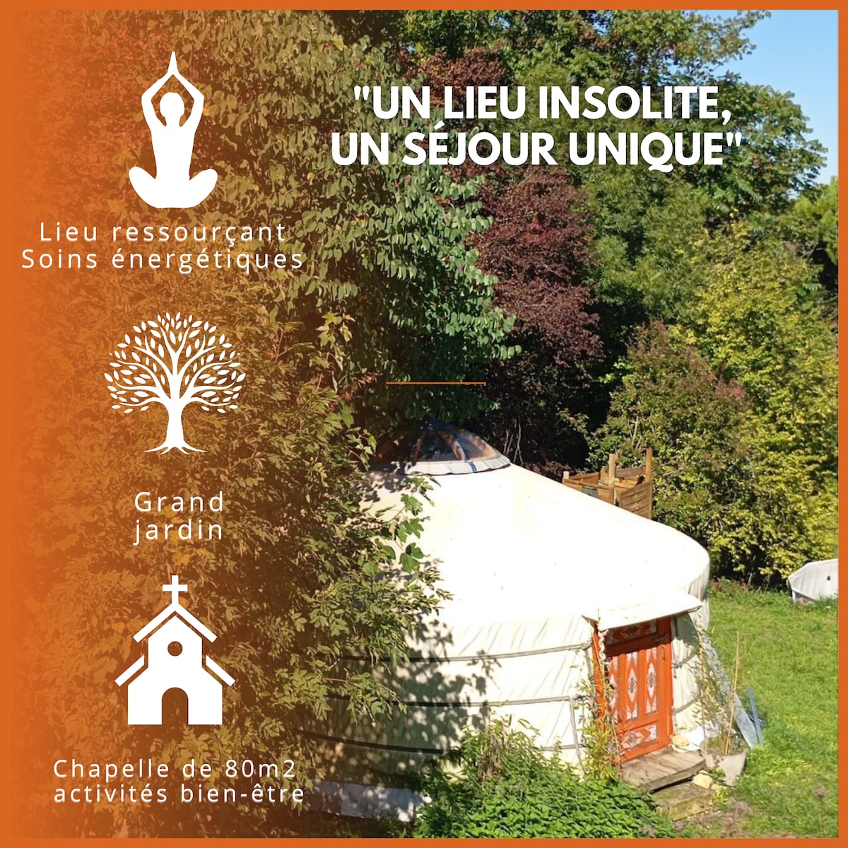 Dans un parc arboré de 8000m2, vous vivrez un séjour ressourçant dans la nature; nos voisins sont les vaches dans le pré d'à côté, les buses, les hérons, les écureuils, les grenouilles de la mare, les libellules...un lieu idéal pour se mettre au vert et retrouver le contact avec la nature! Nous avons à cœur de vous accueillir dans une yourte confortable, le nettoyage de la yourte et des sanitaires est soigné; un coin cuisine est à votre disposition, il est ouvert sur l'extérieur.