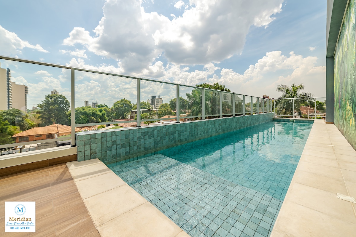 Departamento súper equipado en zona residencial, con balcón y parrilla, hermosa vista y amenities premium: - Piscina con solarium - Piscina climatizada - Sauna - Gym en altura - Rooftop + Quincho - Laundry - Seguridad 24hs - Cochera Excelente ubicación: - A 7 minutos del Eje Corporativo, Shopping del Sol y Paseo La Galería - A 10 minutos de la Costanera y el Puente Héroes del Chaco - A 15 minutos del Aeropuerto Silvio Pettirossi Cuenta con Wi-Fi, Smart TVs y colchones firmes de alta densidad