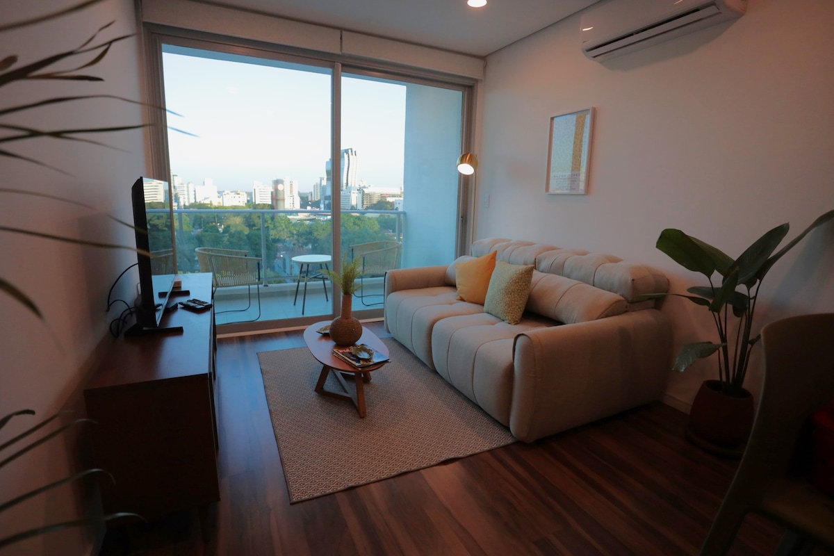 Departamento súper equipado en zona residencial, con balcón y parrilla, hermosa vista y amenities premium: - Piscina con solarium - Piscina climatizada - Sauna - Gym en altura - Rooftop + Quincho - Laundry - Seguridad 24hs - Cochera Excelente ubicación: - A 7 minutos del Eje Corporativo, Shopping del Sol y Paseo La Galería - A 10 minutos de la Costanera y el Puente Héroes del Chaco - A 15 minutos del Aeropuerto Silvio Pettirossi Cuenta con Wi-Fi, Smart TVs y colchones firmes de alta densidad