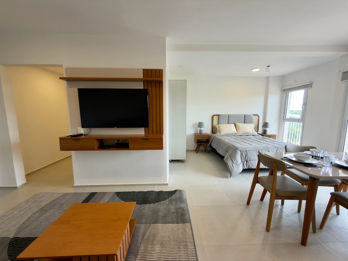 ATTENTION: PARKING SPACE IS NOT INCLUDED, BUT IS AVAILABLE AT AN EXTRA COST. Kick back and relax in this surprisingly roomy studio apartment just outside Asuncion. We have everything for long or short stays. Kitchen is small but fully equipped with fridge, freezer, microwave with grill features, and washer/dryer combo. The complex is near the airport and has ALL THE AMENITIES: padel, tennis, basketball, mini soccer, gym, pool, bar, event space, BBQ, billiards, market, 24/7 security, etc