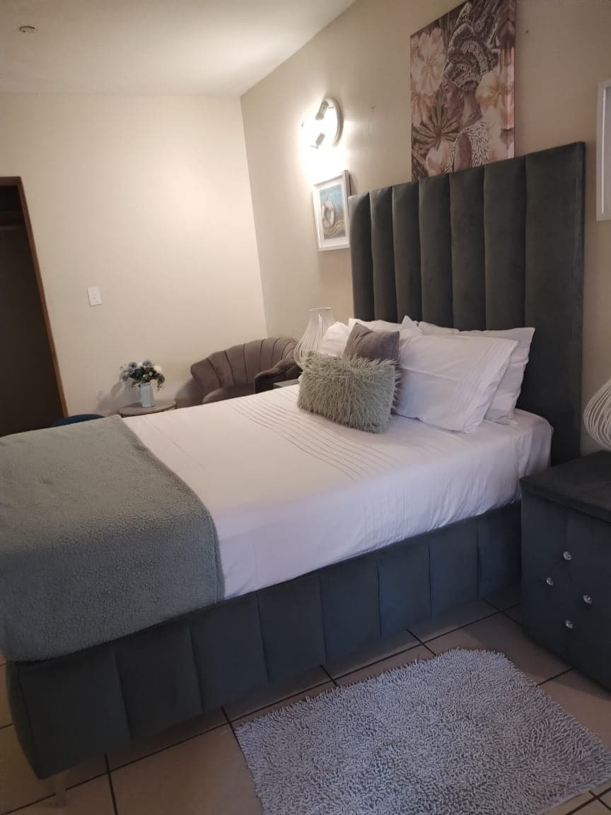 1 Bedroom Flat, (queen size bed), two single beds in living room and kitchen. Private entrance and private garden. Bathroom with shower and bath. Towels and spare blankets provided. Kitchen is equipped with self-catering utensils, stove, fridge with freezer, washing machine, microwave and coffee station. TV with Netflix and free Wi-Fi available. Access to communal pool and braai area. Gated parking with security cameras. Located near mall, hospitals, schools, stadium and nature reserve.