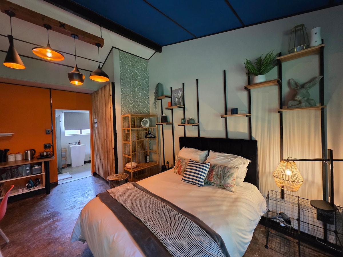 Forget your worries in this comfortable and serene space. The luscious garden will envelop your tired soul after the long journey to our historic town. The space offers a comfortable double bed with en suite private bathroom. Connecting the bedroom with your own private entrance is a heat-n-eat kitchenette with fridge-freezer, microwave oven, kettle, table and chairs, crockery and cutlery. We are centrally located and offer uncapped Wi-Fi and secure off-street parking at your door.