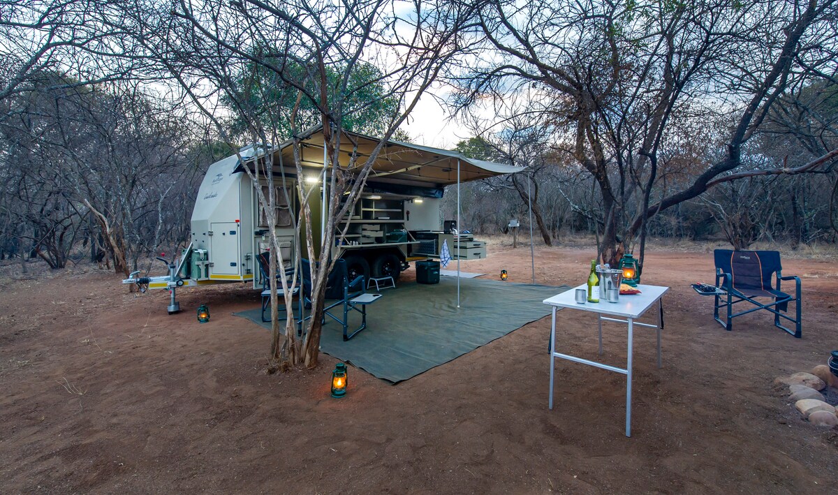Enjoy glamping comfort in this fully equipped caravan that can accommodate up to 4 people. Our glamping luxuries include air conditioning, solar panels, an indoor bathroom and shower, a camping fridge, a microwave, gas stove and an electrical point.