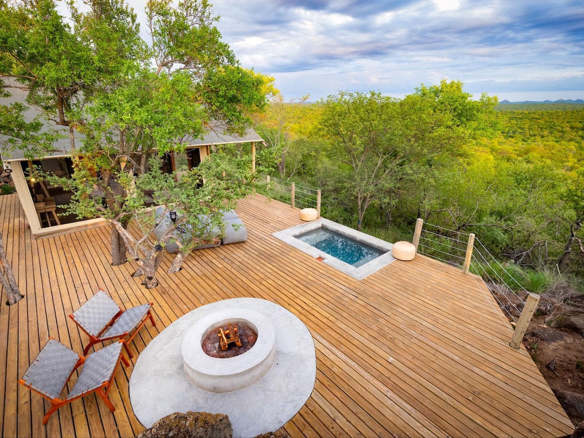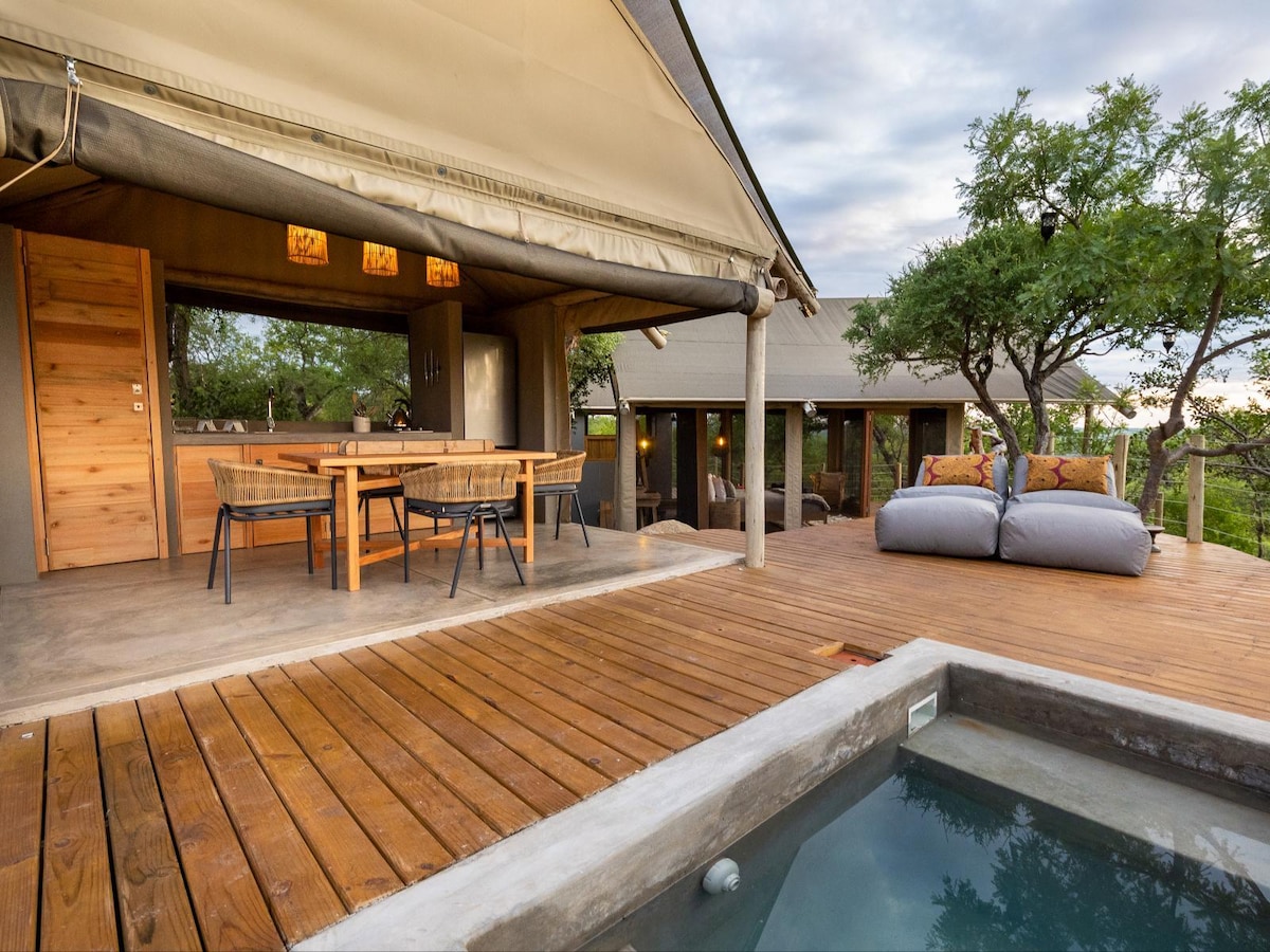 This is a one of a kind luxury tent with en suite bathroom and patio,a separate large fully equipped luxury tented kitchen and dining area, the two are joined with a large wooden deck with a splash pool in the middle just beyond the deck is the braai and fire pit.This establishment is separate from the main lodge and has its own entrance with keypad access.