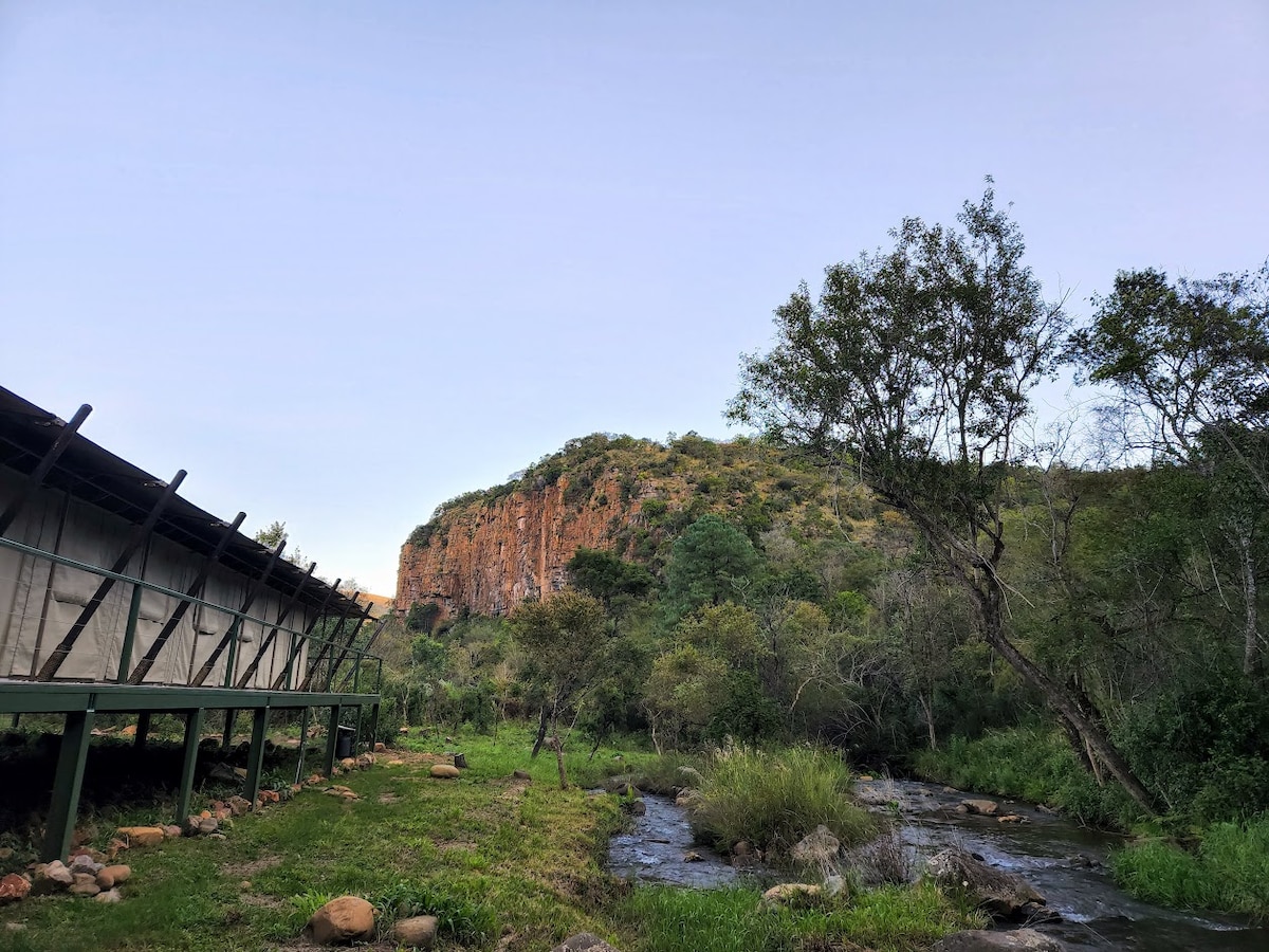 Luxury self catering tented camp in the lowveld bush with stunning mountain views and free roaming wildlife. A truly unique experience where our guests receive an authentic bush experience, with no boundaries between themselves and the naturally occurring animals and birdlife. Sit on your deck with a cup of coffee while a giraffe roams peacefully past you. An opportunity to unwind, recharge and reconnect with nature and yourself.