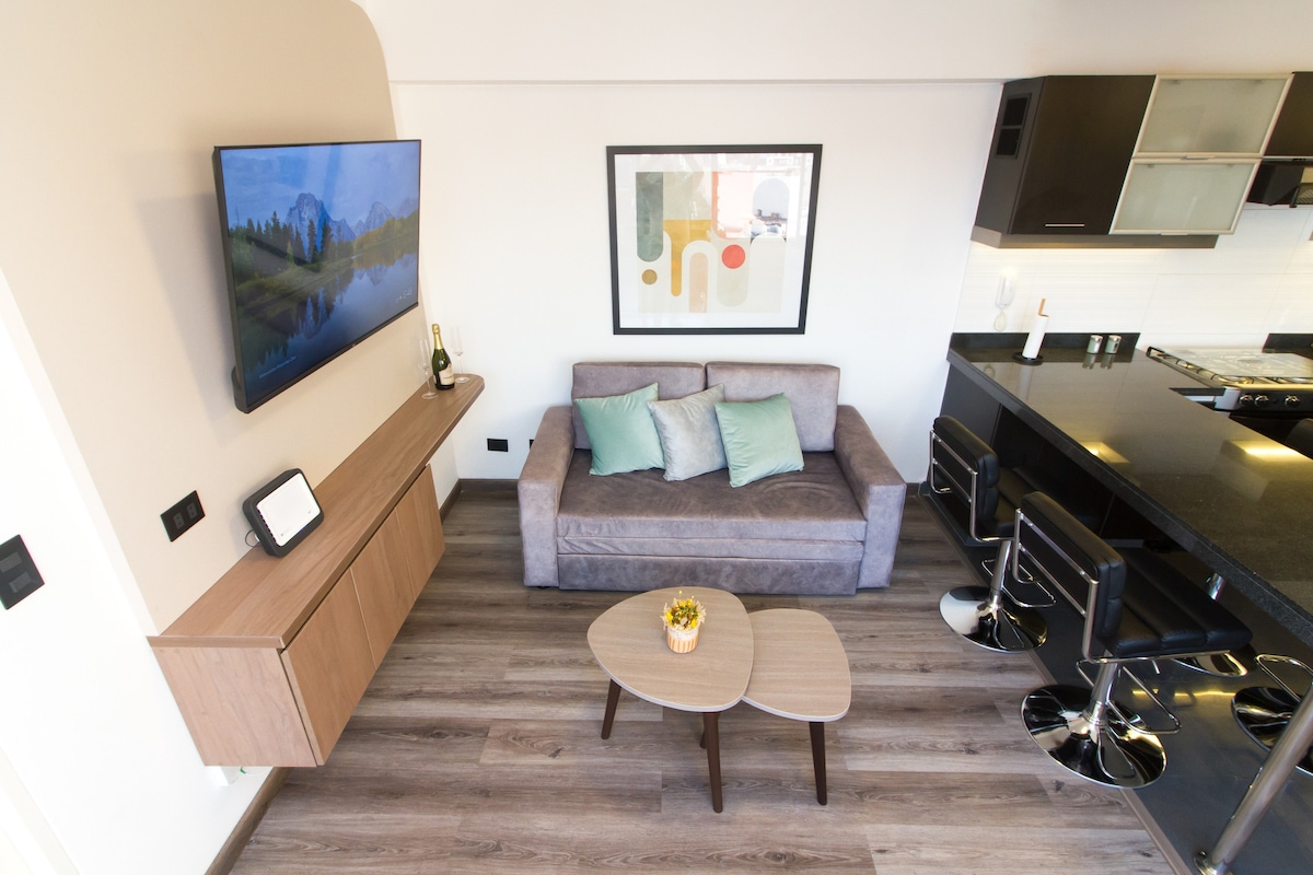 Moderno departamento de 1 habitación con aire acondicionado, lavadora, secadora, TV y control de luces smart. Diseño contemporáneo, impecable y comodidades premium. Perfecto para viajeros que buscan estilo, tecnología y confort. Ubicación céntrica y accesible. Beneficios destacados: •Cerca al centro financiero •A una cuadra de Av. gastronómica 2 de mayo •A 3 cuadras del parque Ramón Castilla, perfecto para hacer deporte matutino •A 5 min del hosp. Rebagliati •Wong a 3 min •Netflix y Direct tv