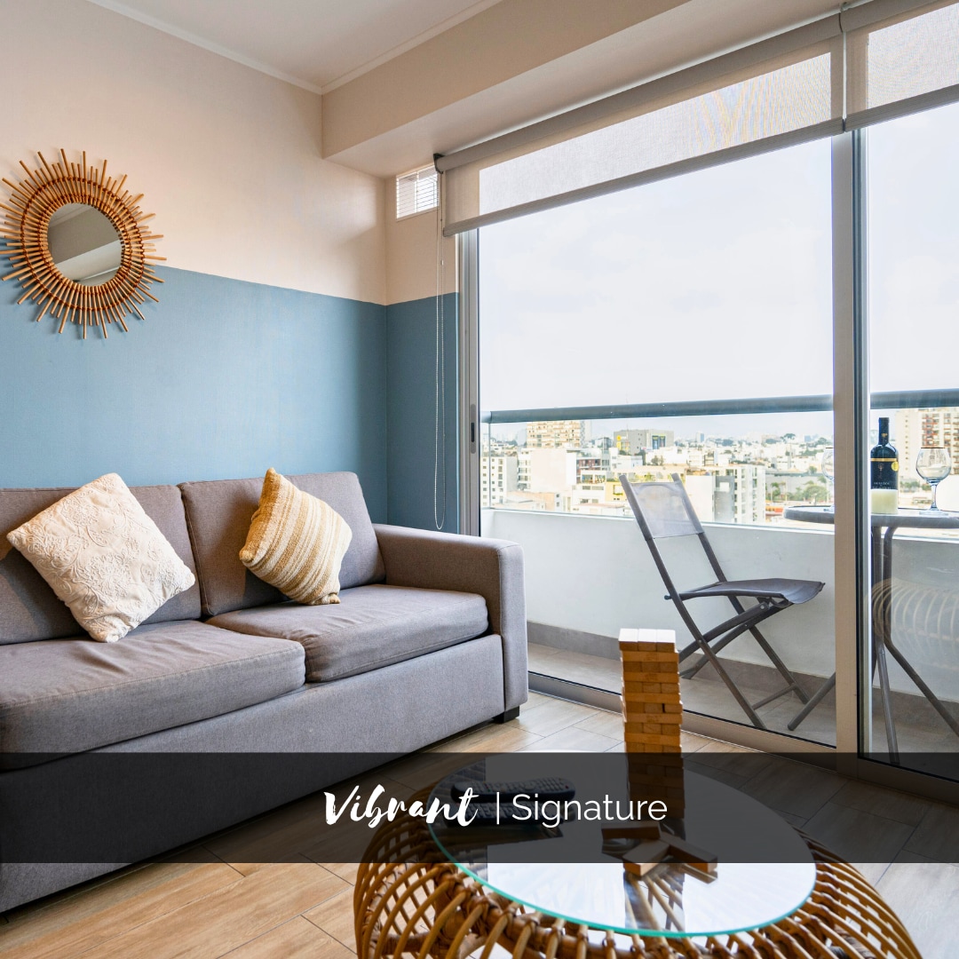 Super well located in MIraflores. Ideal for long stays and working nomads. Beautiful and quiet neighborhood. 1 block from boardwalk and best foodie street in Lima. Cozy, warm, modern, comfortable and very bright. Excellent Wifi! Fully equipped kitchen. Exterior sights and ocean view. Concierge 24hrs. A step away from bars, restaurants, malls, markets, cinemas, galleries and theaters. Beautiful parks with sea sights and outdoor activities. Walking distance from the coolest spots of Miraflores.