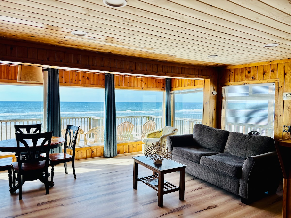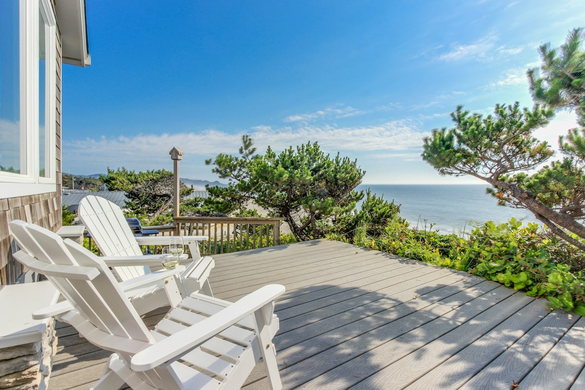 One level Oceanfront bungalow with spectacular views from the wall of double slider doors. Enjoy the ocean sights and sounds from this updated 2 bedroom, 1 bath home. Wood burning fireplace, washer and dryer and propane BBQ. Pets are welcome with a $50 fee and prior approval. We are a fully licensed rental and in compliance with local regulations. Nightly rate includes the 12% Lincoln County lodging tax. Airbnb collects the 2% state lodging tax