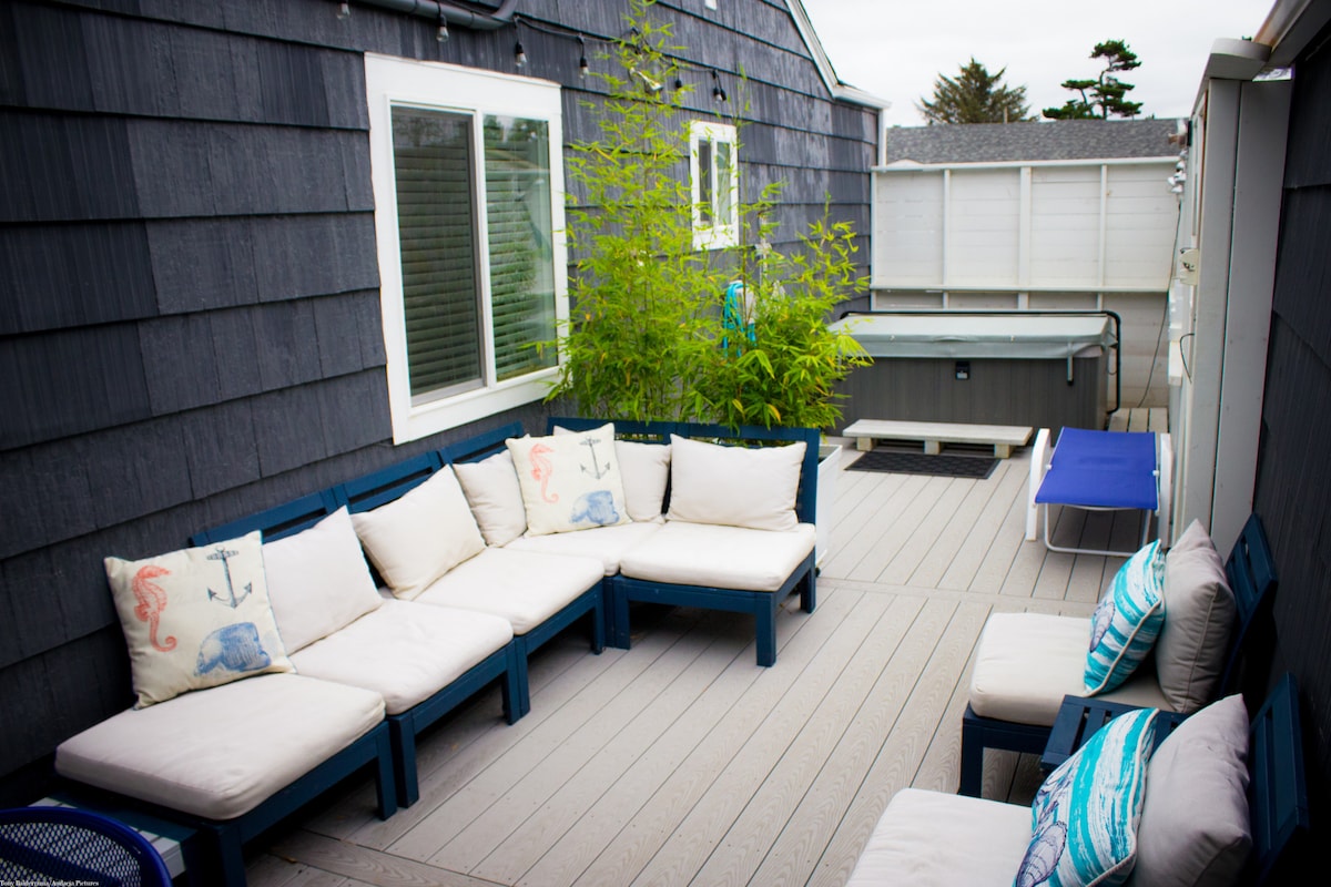Beach cottage, newly remodeled, nestled in a quiet neighborhood, a short walk to 11 st beach access, outlet mall and well known restaurants. You'll find total relaxation by the fire on the patio, in the hot tub under the stars or with a cup of coffee on the deck as the sun rises. A couple yards away from an ocean bluff where the sun sets are breathtaking. 2 bedroom, 2 full baths, full kitchen, laundry, patio, hot tub and hide-a-bed.