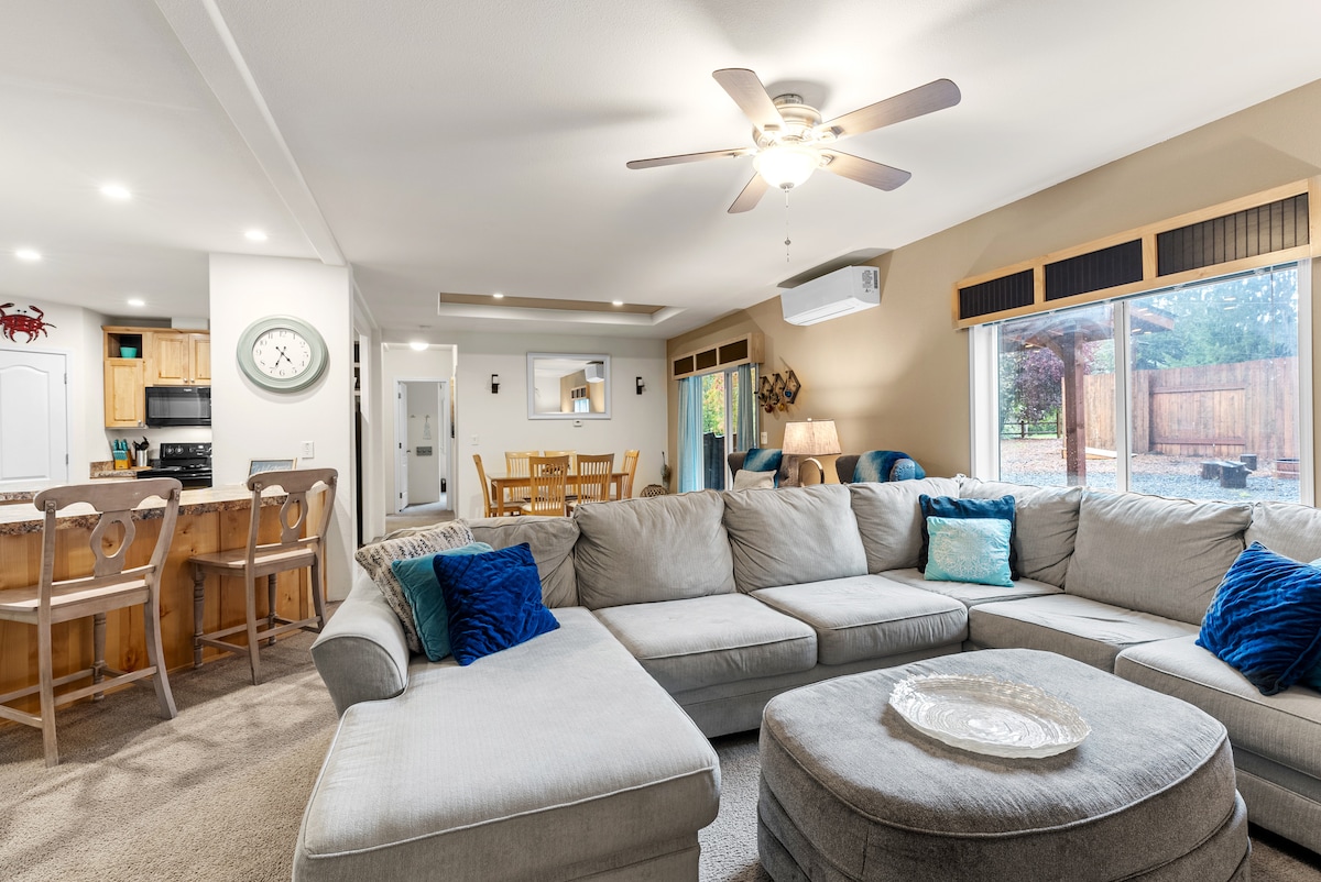 Kick back and relax in this calm, stylish, and family friendly space! Surrounded by lush private landscaping, this is the perfect place to rest and recharge, spend a long weekend with friends/family, or work remotely for a few days. Make s'mores around the Solo Stove smokeless fire pit, or relax in the hot tub. Your kids and dog will love the short walk to the sandy bay, you'll love the short walk to Pelican Brewing's beautiful new brewpub!