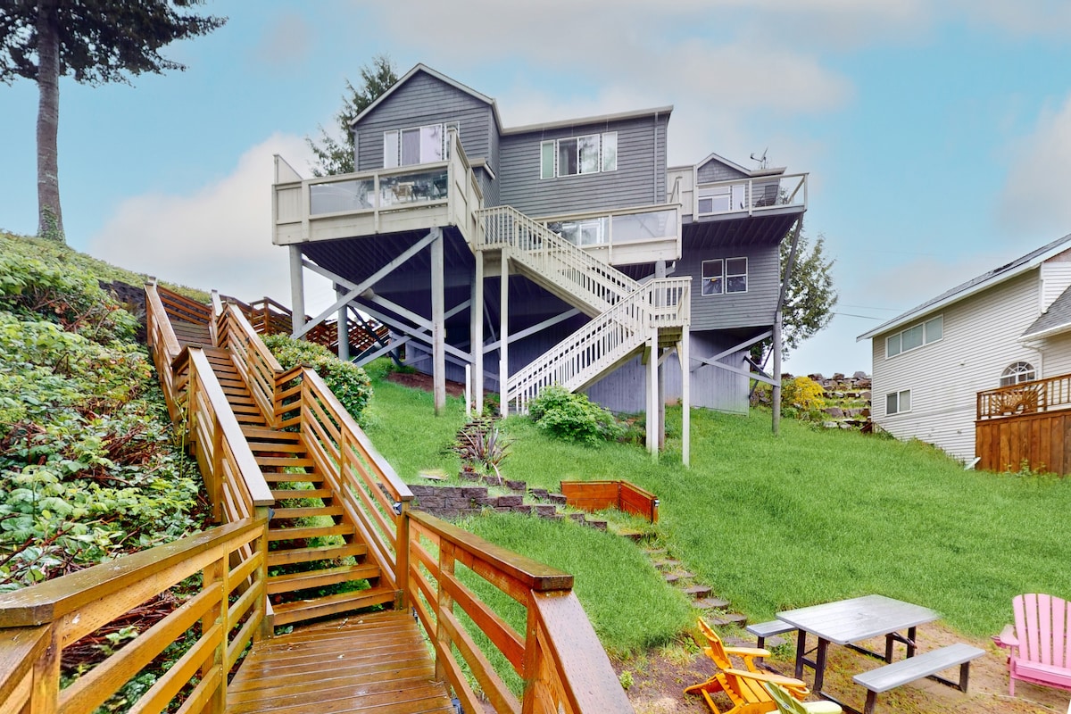 Discover Harbor Lights, your perfect Lincoln City getaway! This cozy, newly renovated cottage in the vibrant Oceanlake district offers a relaxing hot tub under charming lights, partial ocean views from the deck, and is a short walk to the beach. You'll be near shops, restaurants, and attractions like Devil's Punchbowl and Chinook Winds Casino. Enjoy a full kitchen, Wi-Fi, and a gas grill. Create unforgettable memories at Harbor Lights - your ultimate coastal retreat!