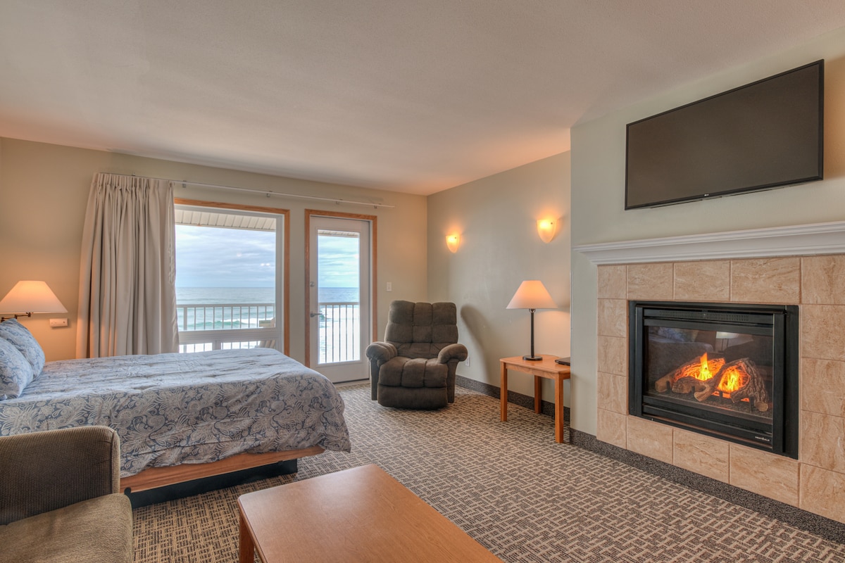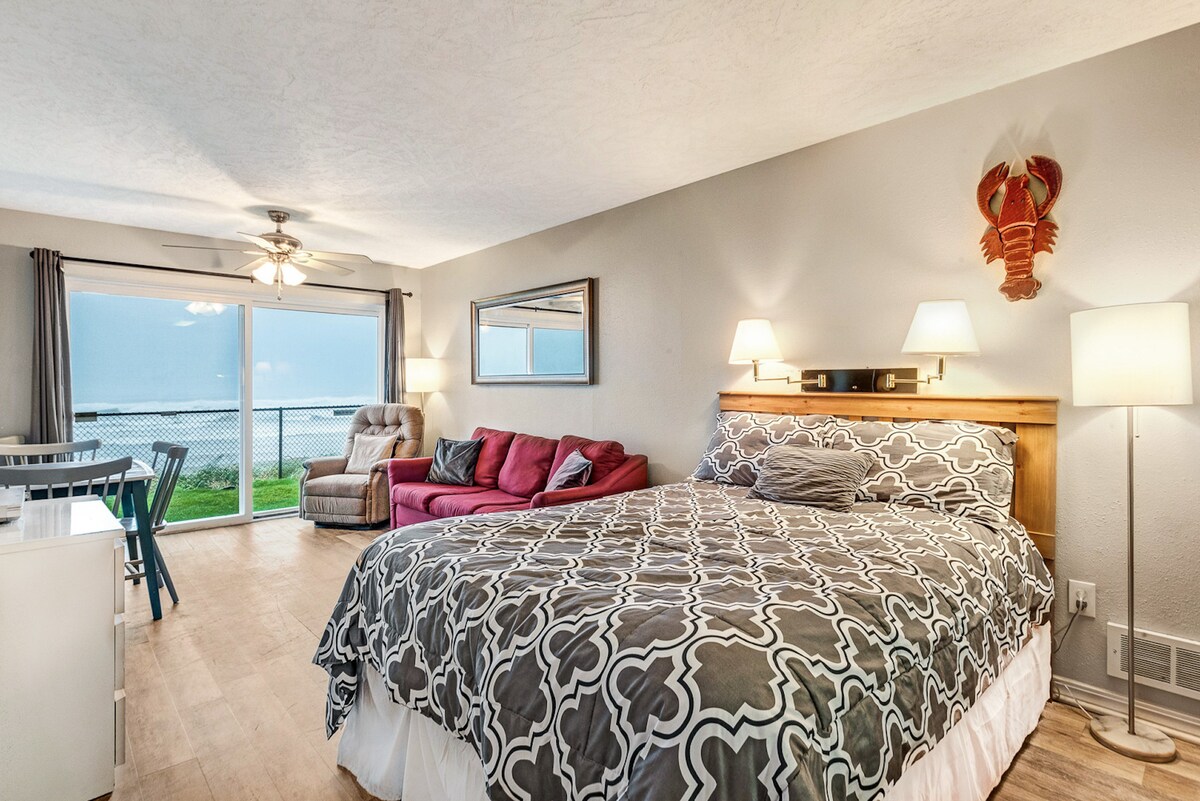 'Silence of the Clams' is what we call this gorgeous oceanfront condo. It can sleep up to four people by way of a king size bed and a sleeper sofa, has a full bathroom with walk-in shower and a full kitchen with its own dishwasher. The beach access is literally right out the oceanside window. If the weather is stormy, stay inside, enjoy the electric fireplace and watch the waves from the amazing view of the oceanside suite. Don't forget about our indoor heated saltwater pool and dry sauna!