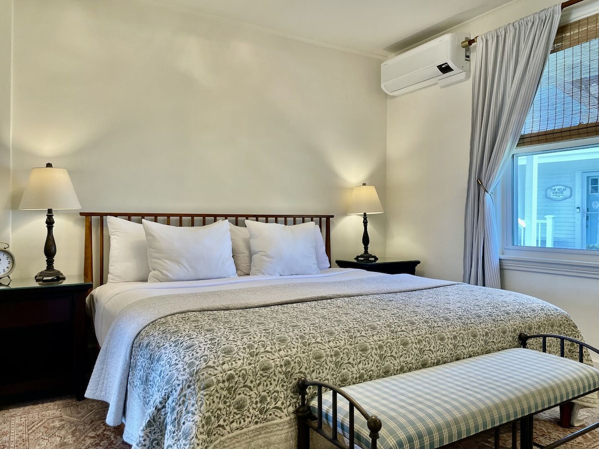 Escape to our historic Greenleaf Inn! This renovated, second-floor King room offers stunning waterfront views of Boothbay Harbor. Perfect for 2 guests, it features a private en-suite bath and A/C. Enjoy shared spaces like a full kitchen, cozy living room, and a sky deck overlooking the water. Just steps from downtown shops and restaurants, it's the ideal coastal Maine getaway.