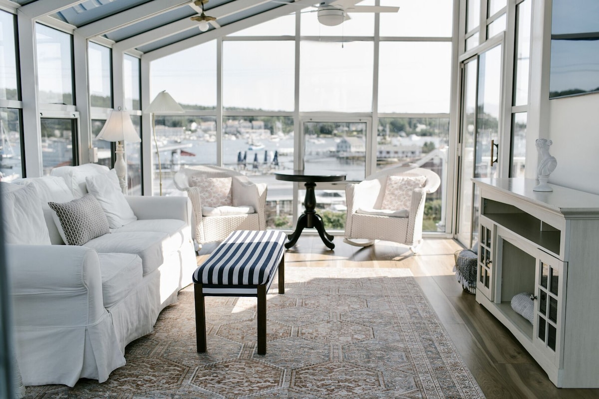 Discover our unique 2-story waterfront suite in Boothbay Harbor! Perfect for up to 4 guests, this suite features 3 private balconies with stunning ocean & harbor views. Enjoy a king bed, queen bed, and cozy fireplace. As part of a boutique inn, you also have access to shared spaces like a full kitchen and a solarium. A charming coastal retreat with modern comforts, just a stroll from local shops and restaurants.
