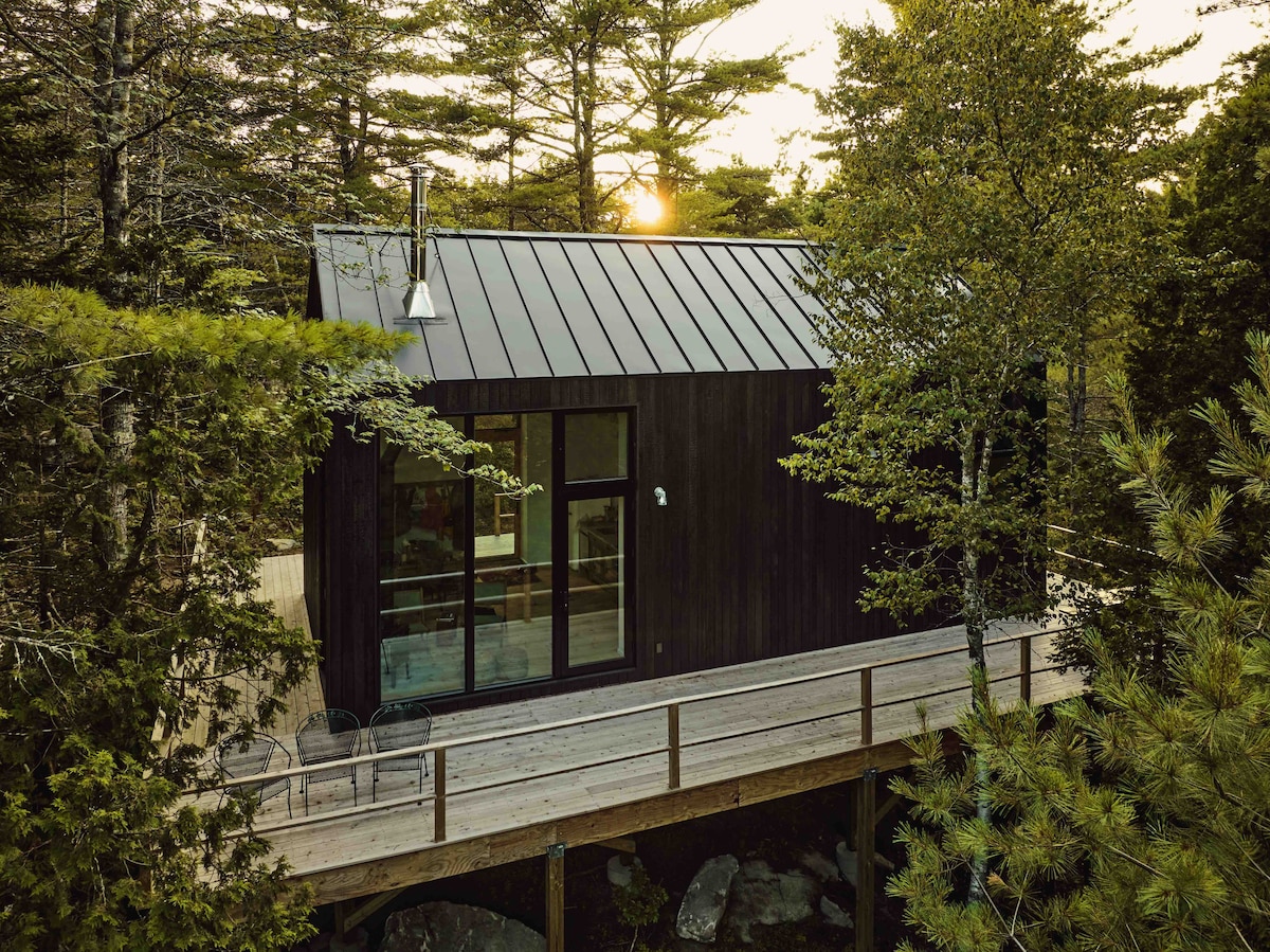 Featured in VOGUE and Maine Home + Design, this modern, handcrafted cabin offers calm Atlantic views, 150 feet of shoreline, and a private dock, perfect for morning coffee, launching a kayak, or watching seals, seabirds, and passing boats. Set among tall pines, it blends Nordic and Japanese influences in a space that is calm and composed. Interiors of wood, stone, lime plaster, and concrete form a grounded, quietly expressive, and sustainably built retreat. 1hr from Portland, but a world apart.