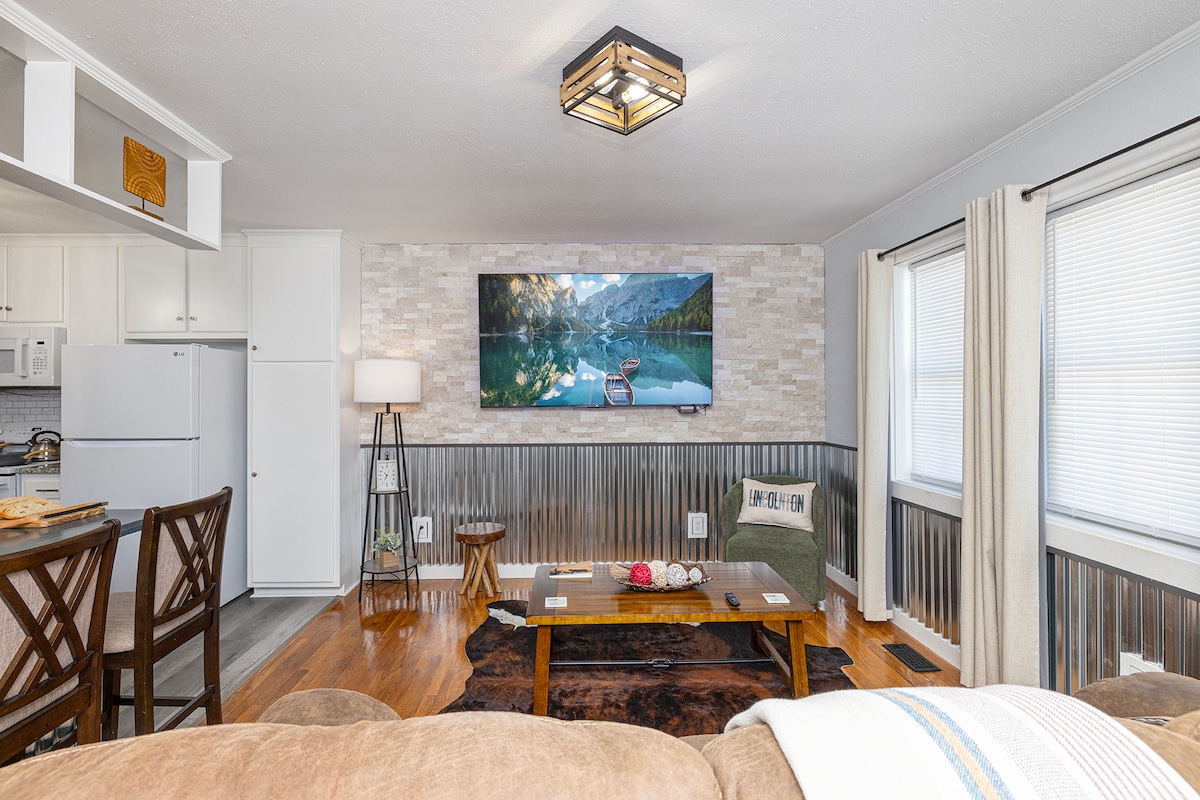 Enjoy this tastefully designed country charmed home blended with stone, metal, and natural wood accents, creating a unique and peaceful setting for your stay. Unwind in the open-plan living area with many authentic touches. You can sink into the dual-sided reclining couch and enjoy your favorite shows on the large Roku TV. For a touch of nostalgia, challenge your friends to vintage Nintendo games like Mario Bros. and Donkey Kong on our classic gaming console.