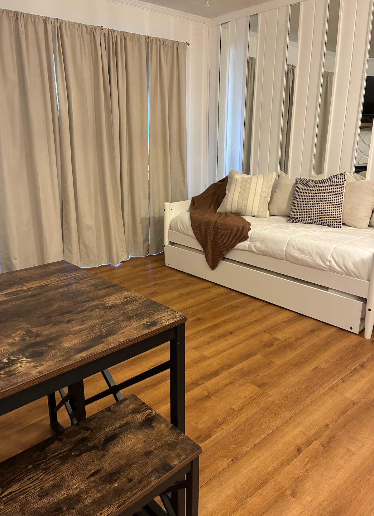 Beautiful and relaxing cabin style condo in the heart of Ruidoso, Very spacious 1 bedroom 1 bath, with a king bed, a sofa bed with comfortable matress and bunk beds. Kitchen fully equiped , dinning room table for up to 6, table games for you to enjoy. Walking distance to Farleys rest. and the bowling alley, 5 min drive to snow tubing. Short drive to Ski and downtown. Perfect getaway for a small family or a group of friends. Come enjoy the nature and let us provide you with the best comfort.