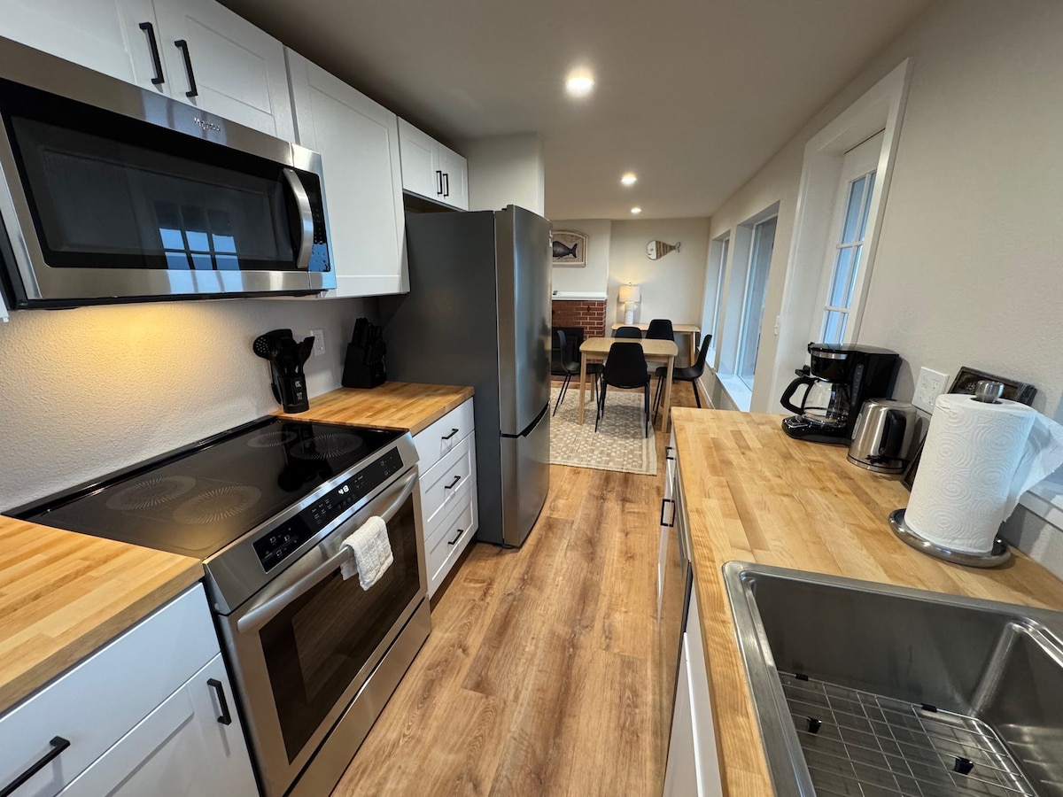 Experience the magic of the Oregon Coast in this freshly renovated oceanfront duplex cottage with gas fireplace, perfectly positioned on pristine Big Stump Beach. Step outside your door onto miles of sandy shoreline, where the rhythmic waves and coastal breeze create the perfect backdrop for your beach getaway. Inside, you'll find a thoughtfully updated interior featuring a fully equipped kitchen with modern amenities, including a dishwasher for effortless cleanup after seaside meals. The cottage accommodates up to four guests with a king bed in the bedroom and a full size sleeper sofa in a cozy TV nook off the living room. The covered oceanfront deck allows you to take in the sounds of the ocean while staying protected from the weather. The gas fireplace adds to the warm and inviting atmosphere throughout your stay. Your Perfect Base for Coastal Adventures: North to Waldport (minutes away): Dive into authentic coastal activities like crabbing from Dock of the Bay or McKinley's Oregon Coast Marina. During low tide, try your hand at clamming near the bridge. South to Yachats (just a few miles): Discover charming restaurants and explore remarkable rocky tidepools along the dramatic coastline. Further Explorations: Visit the fascinating Newport Aquarium (30 minutes north) or embark on an adventure at the Sand Dunes (45 minutes south) - accessible by foot, ATV rental, or guided tour. Traveling with a group? Cape Cod Cottages features eight additional units on the property, perfect for family reunions or friend gatherings. Shared amenities include: 300 feet of private beach access Entertainment-ready game room featuring foosball and ping pong Free guest laundry facilities Three EV charging stations