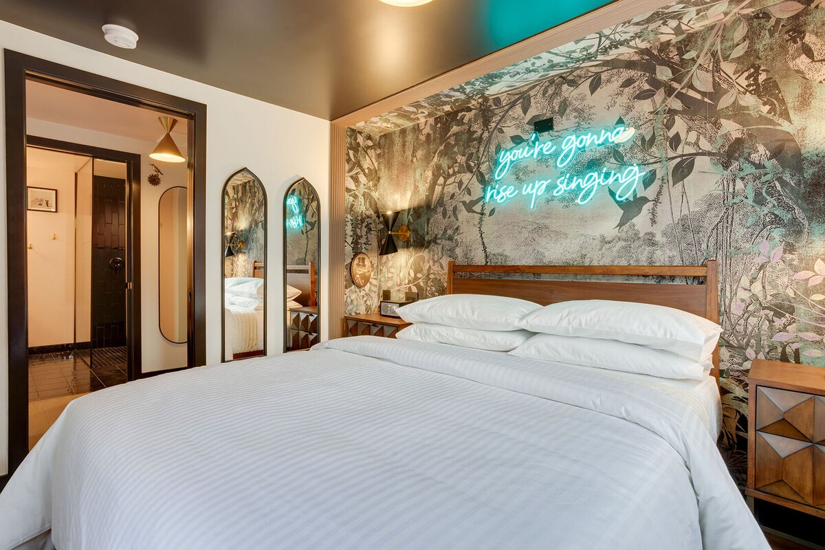 The "King of Swing" -Italian-American trumpeter, singer, comedian, entertainer, and bandleader, Louis Prima- inspired this modern deco room with design nods to Prima's longstanding residency in Vegas. Whether you're looking for a playful, design-forward lodging experience, or just a luxurious and comfy room as you vacation beachside, you'll love our eco-friendly amenities and a bed that gives you a perfect night's sleep. There's also a living room-like sitting area.