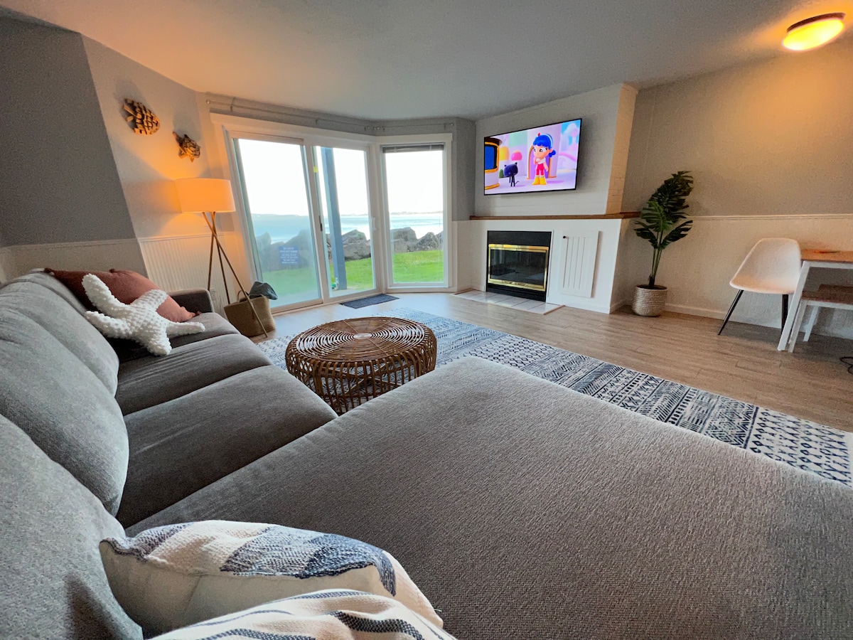 Welcome to a peaceful oceanfront escape designed for slow mornings, storm watching, and quiet time together, with waves crashing just beyond your patio. - Sleeps 2 | 1 bedroom | 1 bed | 1.5 baths - Private oceanfront patio w/ year-round hot tub - Gas fireplace & large ocean-facing windows - Shared indoor pool, hot tub & gym - First-floor corner condo - single level, no stairs - Kitchen, in-unit washer & dryer, smart lock entry
